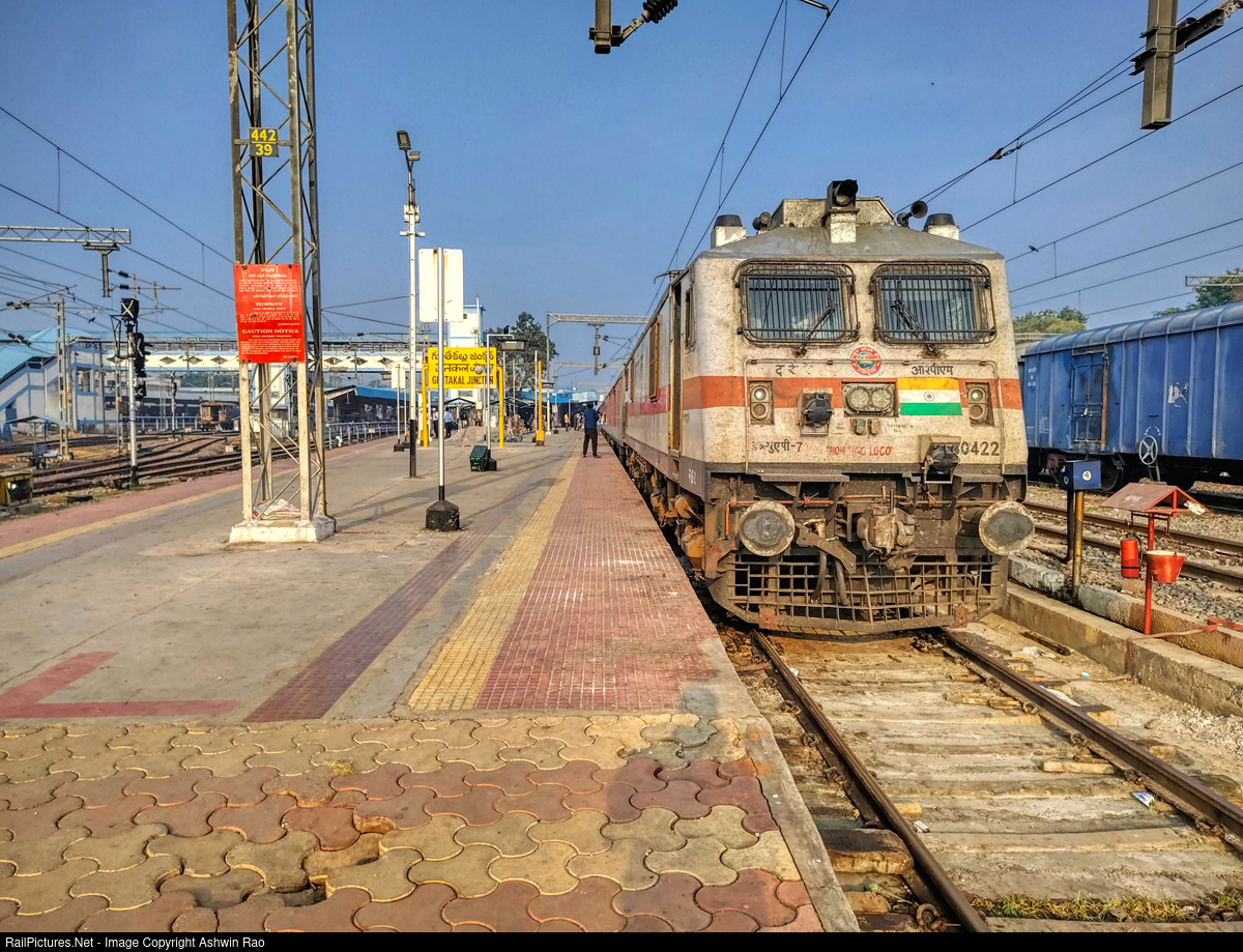 | WAP-7 #30422 from Royapuram shed storms into Guntakal Junction with 12163 LTT (Lokmanya Tilak Terminus Mumbai)–Chennai Central Superfast Express, making its scheduled halt as the day awakens under soft morning light |