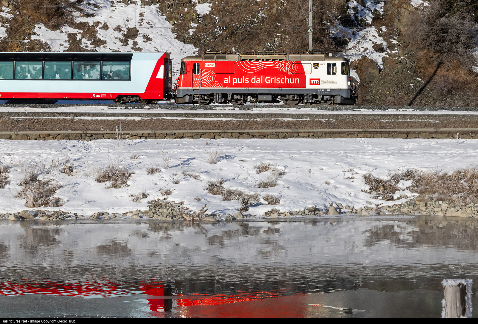 Ge 4/4 II # 633 of the Rhaetian Railway, in the "al puls dal Grischun" paint scheme, pulls the PE 905 GLACIER EXPRESS from St.Moritz to Zermatt along the inn river between Celerina and Samedan.