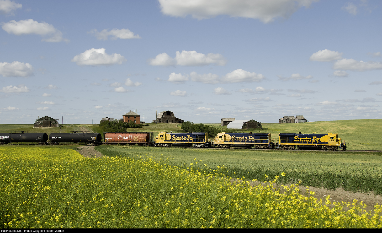 Great Sandhills three B-23-7’s pass an old farm on the prairie east of Abbey, SK with a train of gas cars from the plant at McNeil., AB. The train from Leader is bound for the CP interchange at Swift Current on