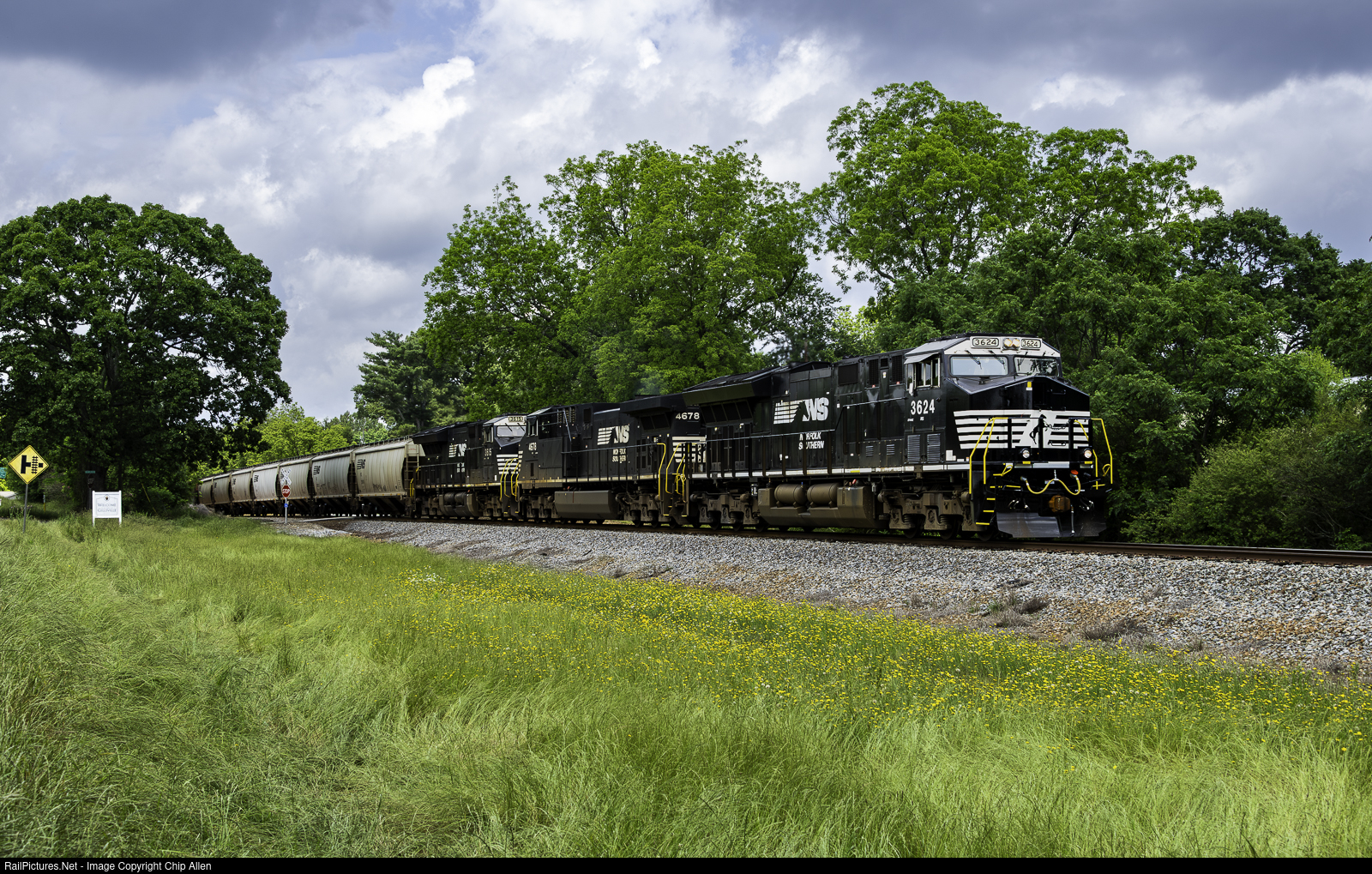 | Cruising by a field of blooming wildflowers as clouds build overhead, Maysville-bound grain train 50R is almost at its destination halfway down the Commerce Branch between Lula and Athens, GA. The 3 AC motors are all needed to get this tonnage train over the undulating Commerce Branch. |