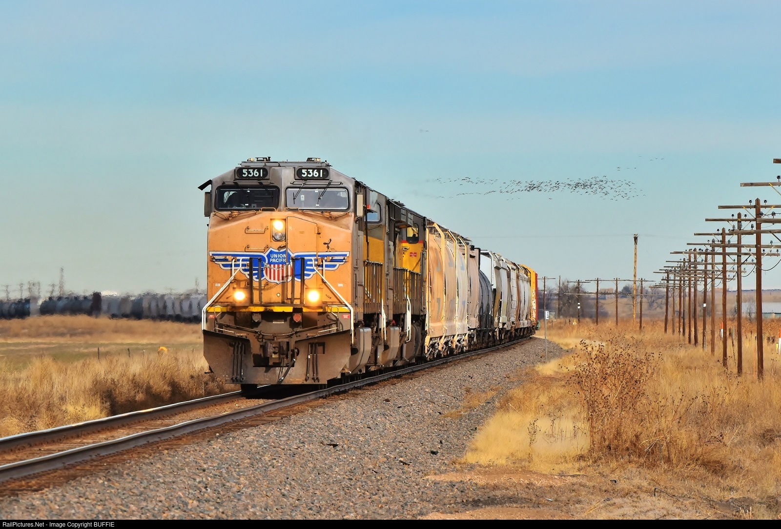 The geese are flying as UP 5361 (ES44AC) heads south on the Greeley Sub towards Fort Lupton, Colorado.