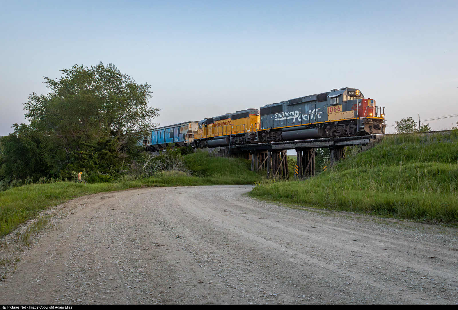 | LNM34 heading North across one of the many wooden trestles that still remain on the Oskaloosa Branch in Central Iowa. |