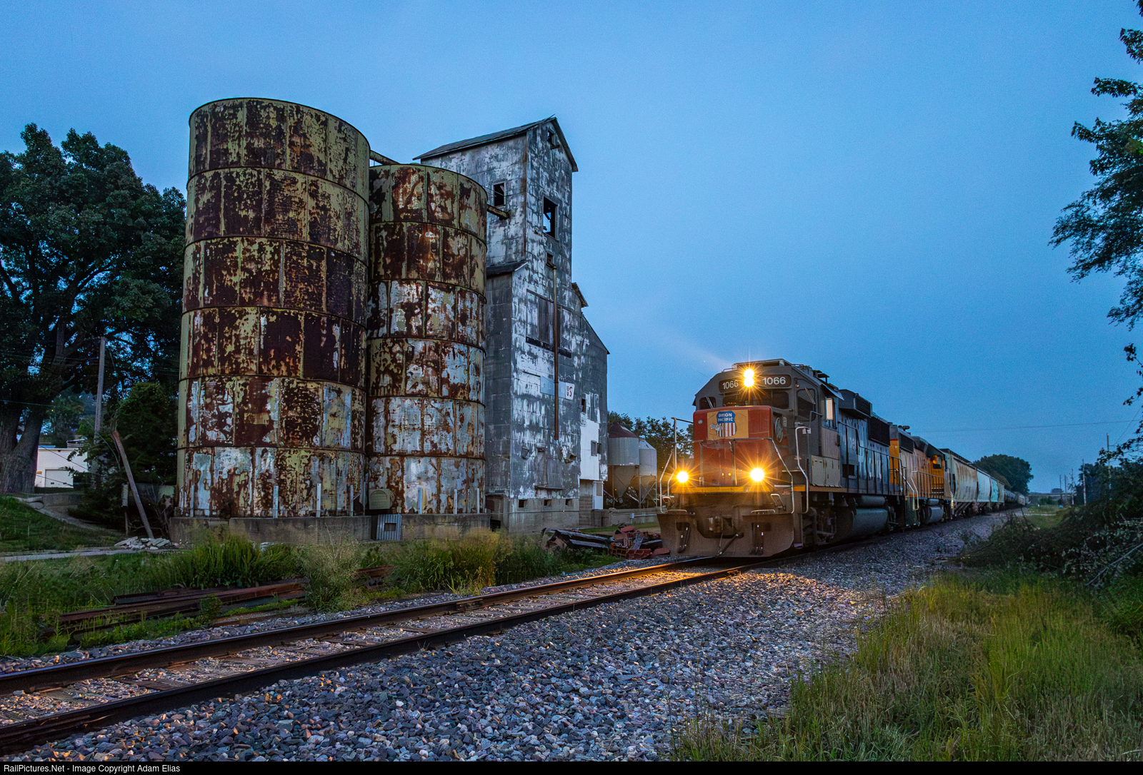 | This former SP GP60 leads its Northbound freight by a very old elevator complex in the small town of Searsboro, Iowa, on UP's Oskaloosa Branch. This branch is a neat one to shoot. |