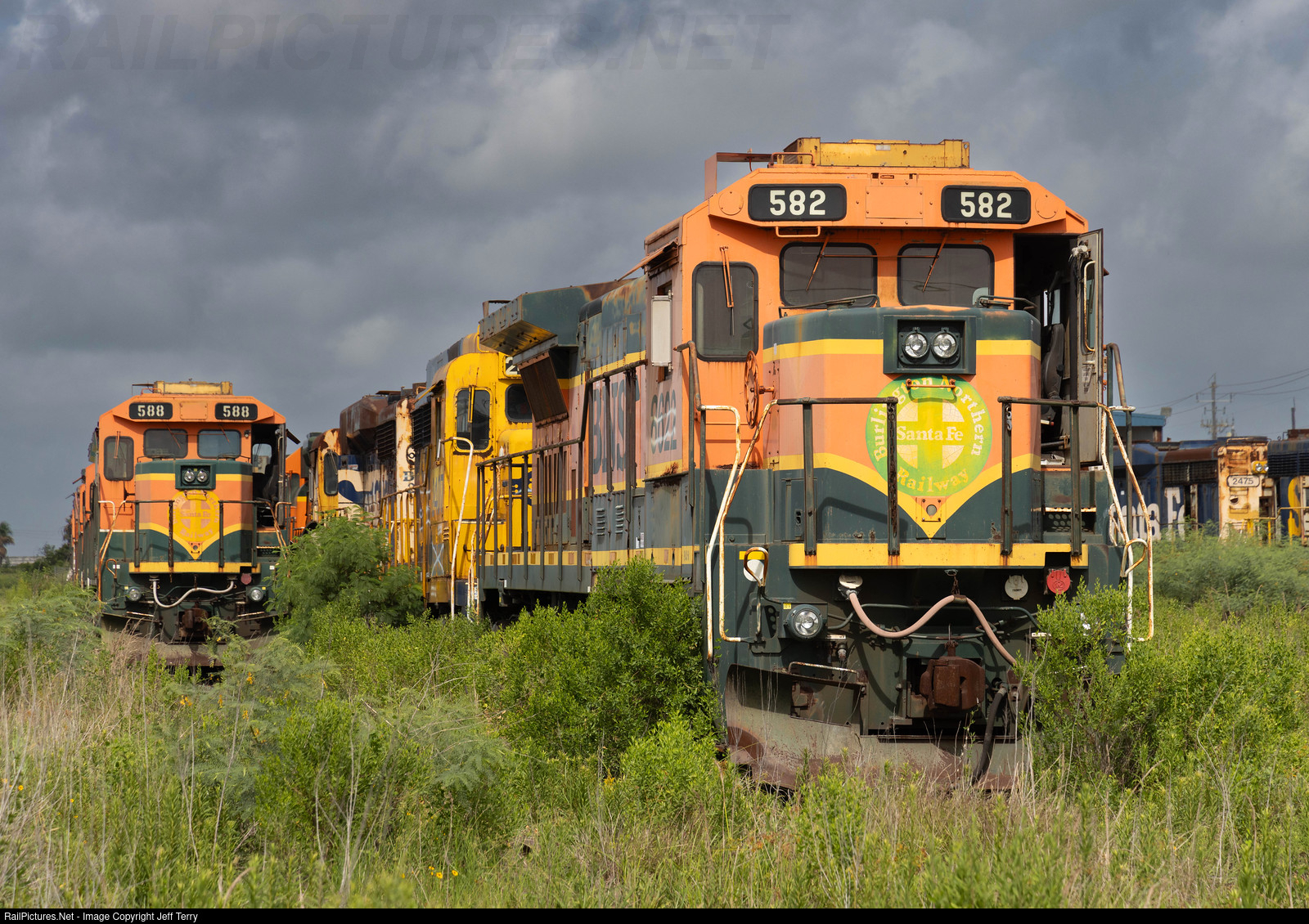 BNSF 582 and 588 sit cold and dead in a weed-covered yard near the Port of Galveston. The units are one of several stored in this "locomotive graveyard."