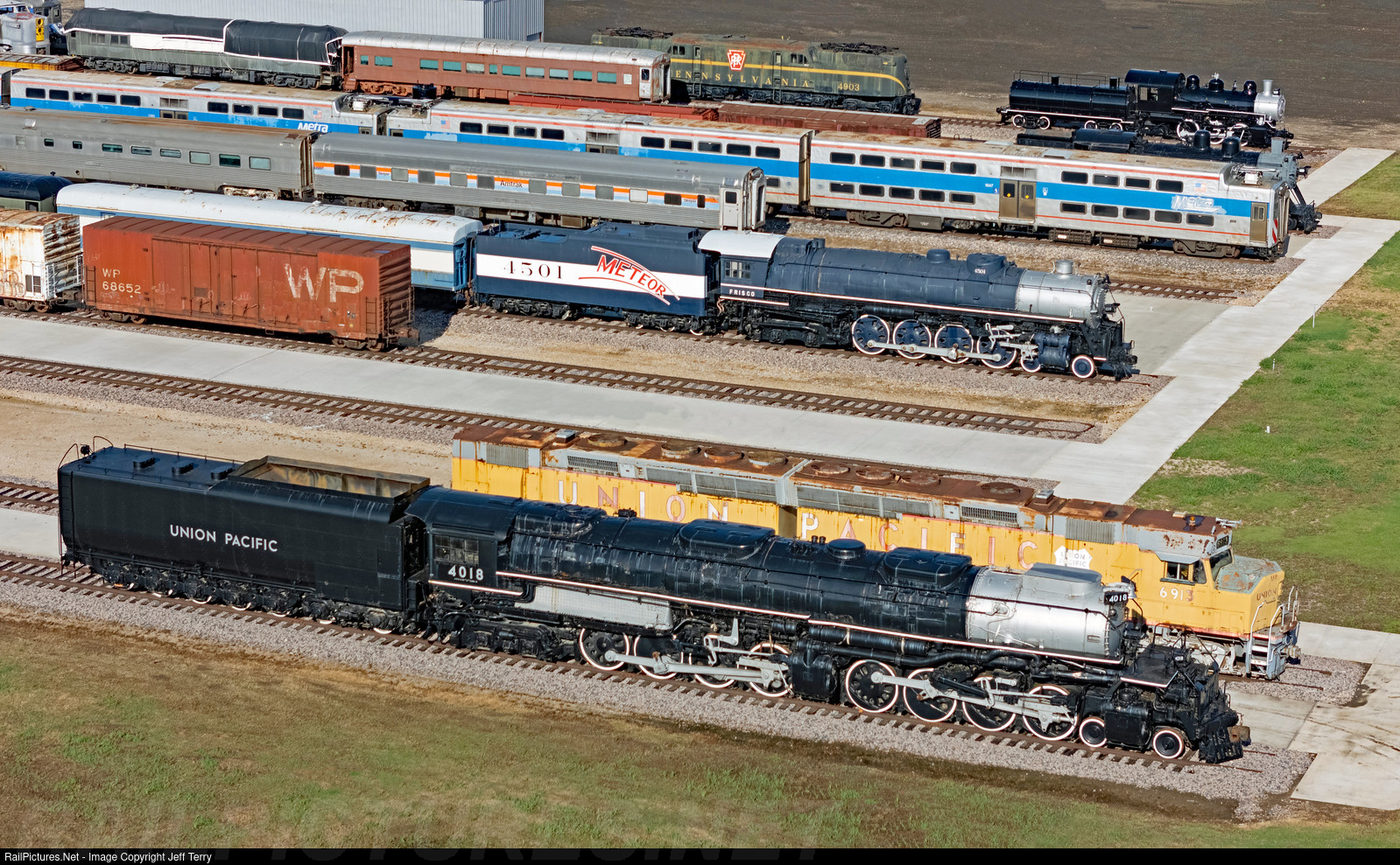 Union Pacific 4018 is displayed in the company of UP DDA40X 6913, Frisco 4-8-4 4501, and a Pennsylvania GG1 at the Museum of the American Railroad in Frisco, which celebrates all US railroads. The museum also has a wide variety of passenger and freight equipment, including several METRA commuter cars that are used as classrooms.