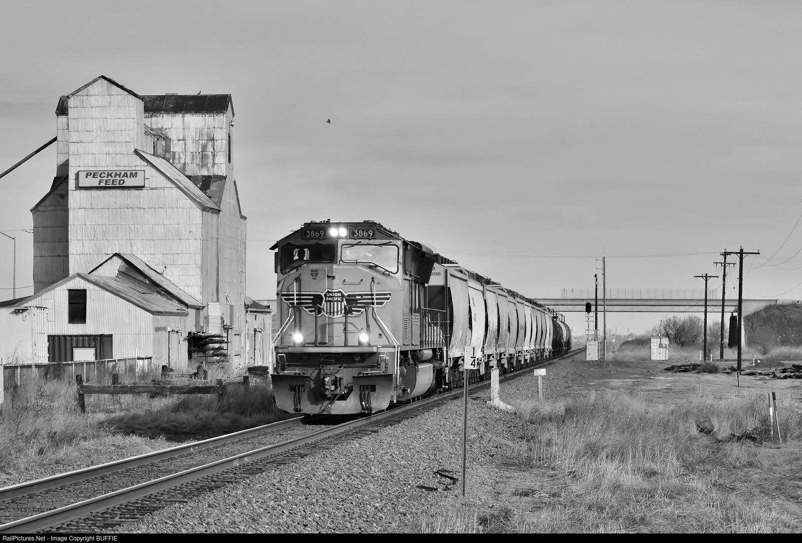 UP 3869 (SD70M) runs past the Peckham Silo as it heads south on the Greeley Sub.