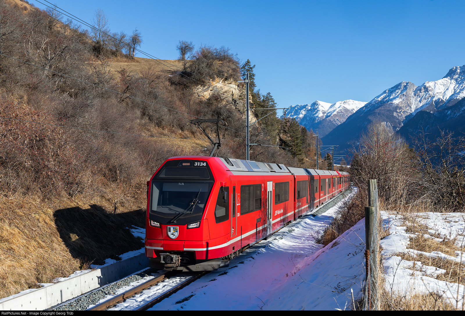 | "Capricorns" ABe 4/16 # 3134 and # 3159 of the Rhaetian Railway in multiple control are running the RE 1240-1040 of the line RE4 between Scuol-Tarasp and Ftan Baraigla. |