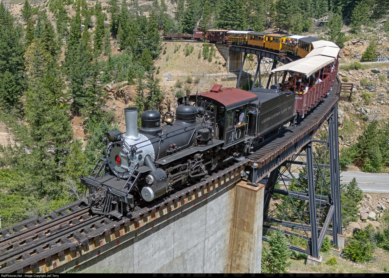 | Georgetown Loop 40 rolls across the rebuilt Devil's Gate High Bridge spanning Clear Creek. The original was torn out (along with the trackage) in the 1930s, and rebuilt by the Colorado Historical Society in 1983-84. |
