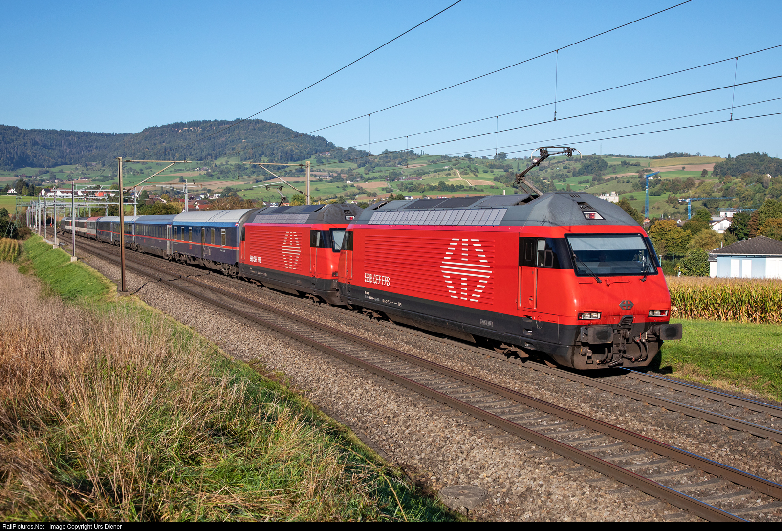 | The two SBB locomotives Re 460 014 and Re 460 067 are pulling the night train NJ 471 from Hamburg Altona (Germany) towards Zurich HB. |