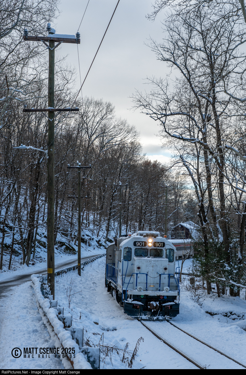 New Hope Railroad (NHRR) GP39 no. 901 is seen leading the North Pole Express through the woods of New Hope as it returns to the namesake town. The unit is a recent arrival to the NHRR, formerly a work / freight locomotive for the Utah Transit Authority (UTA) FrontRunner commuter rail system in Salt Lake City, arriving here in August 2024. It was built in 1967 as Louisville & Nashville (L&N) GP40 no. 3025, and served Seaboard (no. 6821), CSX (no. 6821), and Virginia Railroad Express (GP39 no. V07) prior to UTA service.