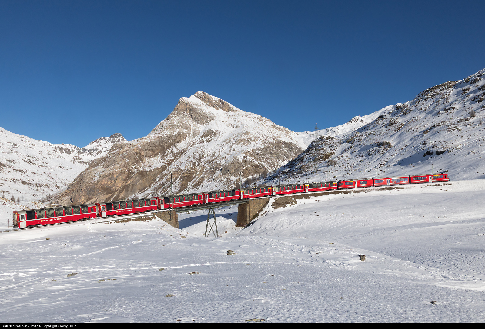 | "Allegra" railcar ABe 8/12 # 3503 of the Rhaetian Railway pulls the 7-car PE 951 BERNINA EXPRESS from Chur over the Albula and Bernina UNESCO world heritage lines throughout to Tirano, over the upper Ova da Bernina bridge near the Alp da Buond Sur between Bernina Lagalb and Ospizio Bernina. |