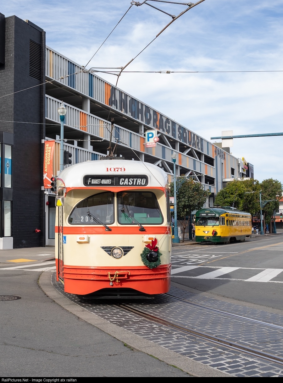 | MUNI #1079 (Detroit) departs for The Castro, while MUNI #1071 (Minneapolis/St Paul) lays over at Fisherman's Wharf. |