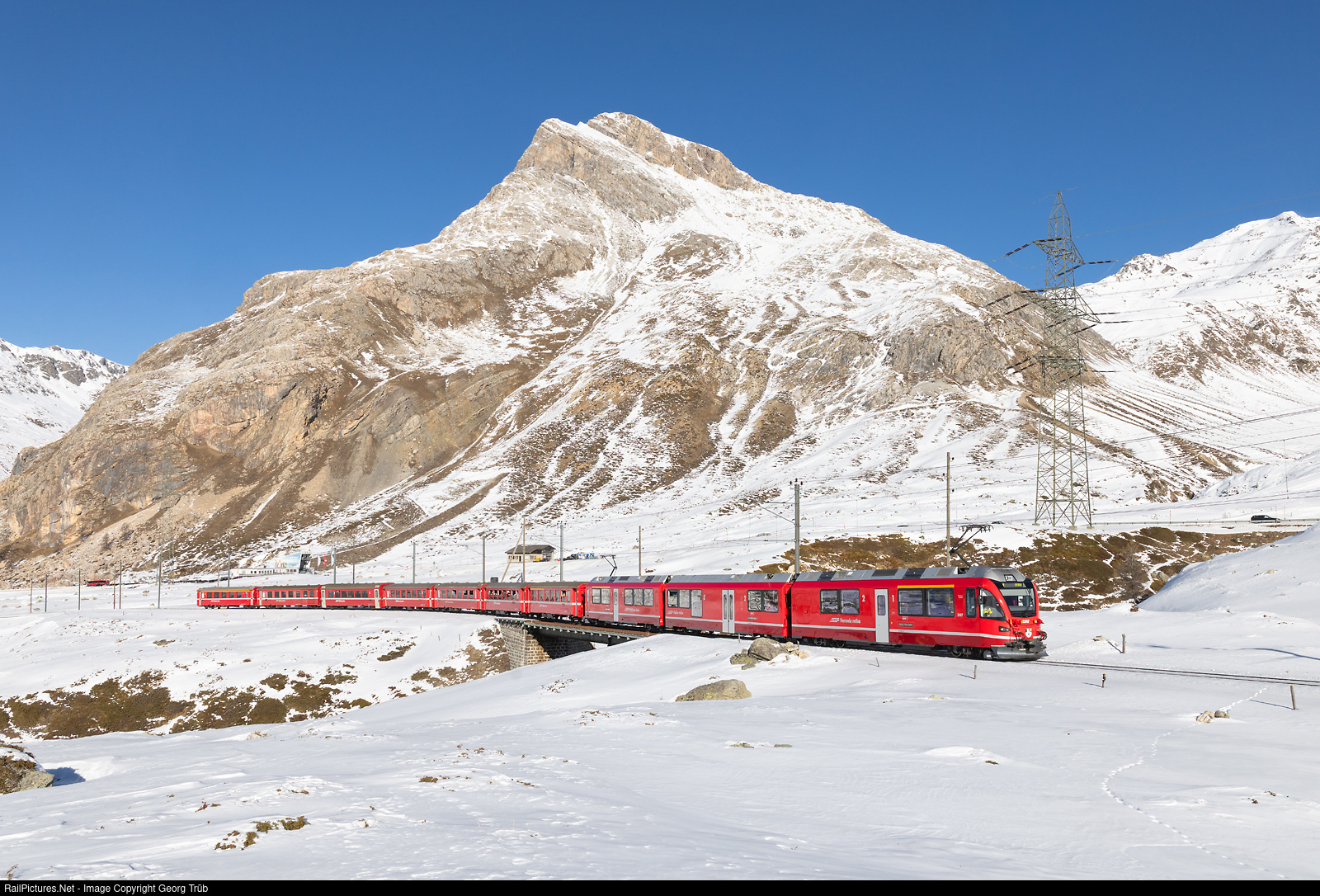 The Bernina Line of the Rhaetian Railway has seen a sharp increase in passenger numbers over recent years. Of course, it is one of the most beautiful railway lines in existence. Over the Christmas and New Year holidays, the rush, especially from Italy (Tirano), is almost impossible to cope with. All RhB rolling stock that can be used on the Bernina line with its tight curve radii is then in service. In the morning in Tirano and in the afternoon in St. Moritz, long queues of passengers form, waiting for a ride. "Allegra" railcar ABe 8/12 # 3507 pulls the 7-car train 4629 from St.Moritz to Tirano over the lower Ova da Bernina bridge between Bernina Lagalb and Ospizio Bernina.