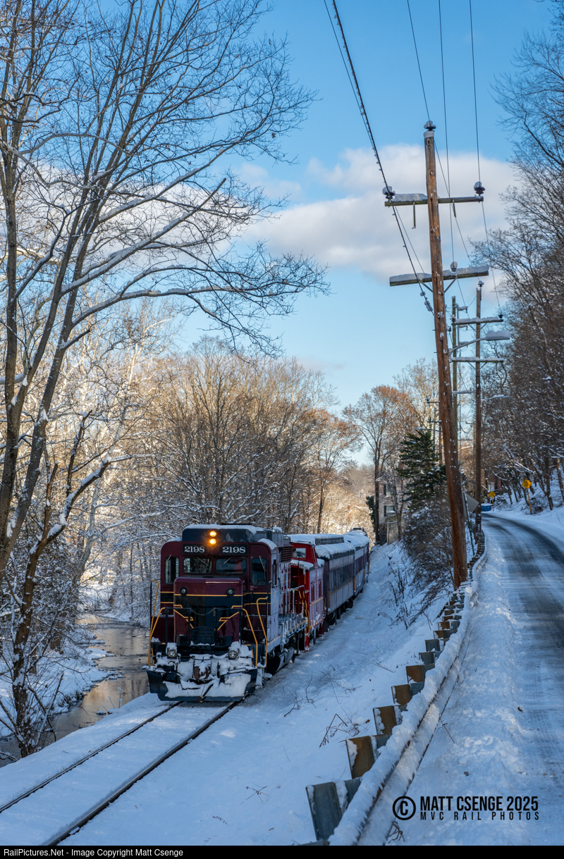 New Hope Railroad (NHRR) GP30 no. 2198 brings up the rear of the North Pole Express as it makes its way back to New Hope Station. The unit started life as Pennsylvania Railroad 2250, before being renumbered and transferring to Penn Central and later Conrail ownership. |