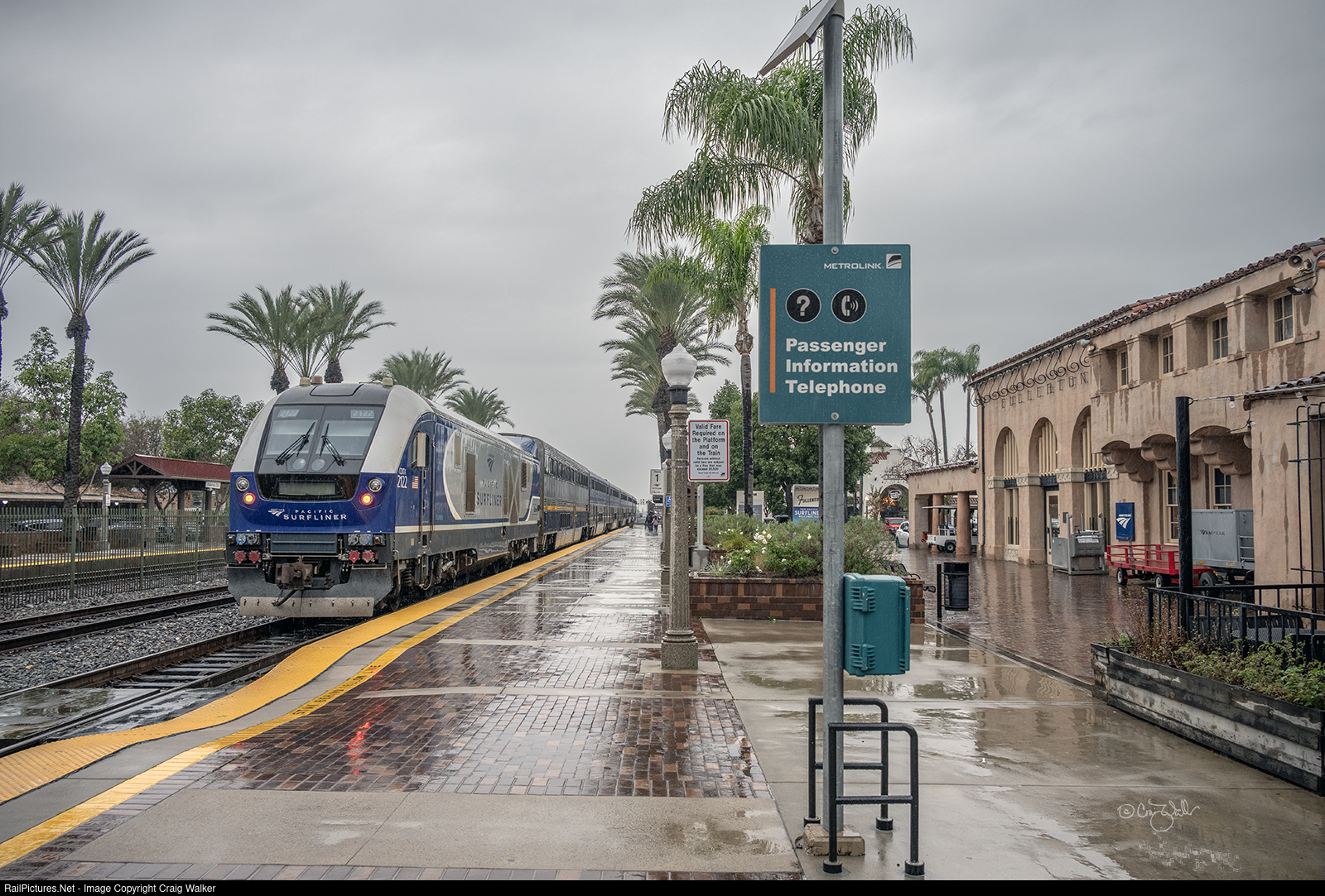 The rain allowed me to not worry about shadows, and so as Amtrak Pacific Surfliner 577 departed the station, I was able to grab a shot that doesn't always work on a brightly lit day – shooting the "shady side" of the train and also getting the nearly 100-year-old station in the same shot as this Surfliner, normally numbered 777 but, on this holiday, truncated to just San Diego to Los Angeles (too bad for those needing to get to San Luis Obispo, I suppose) and thus the 500-series train number, and final stop, for the day.