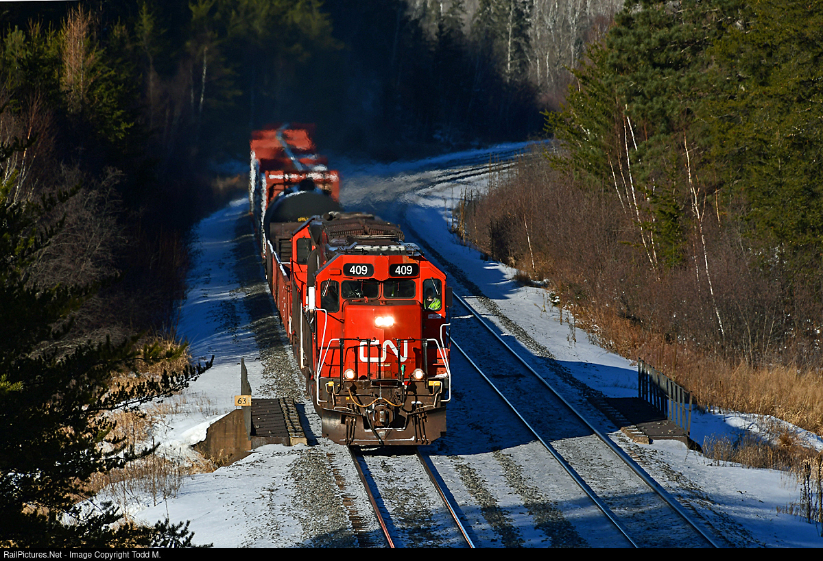 | DMIR 409 and DMIR 404 catch some sun as they head south on the Missabe sub with their destination of Keenan yard not too much farther where they will shove in, drop these cars, pick up a few and head back to Two Harbors, MN. |