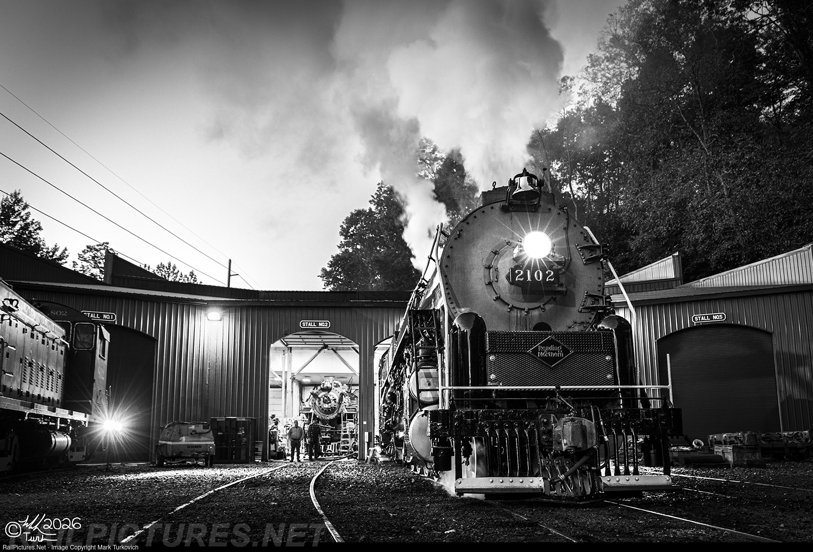 Reading 2102 simmers outside of the Reading & Northern Steam Shops on a cool October morning.