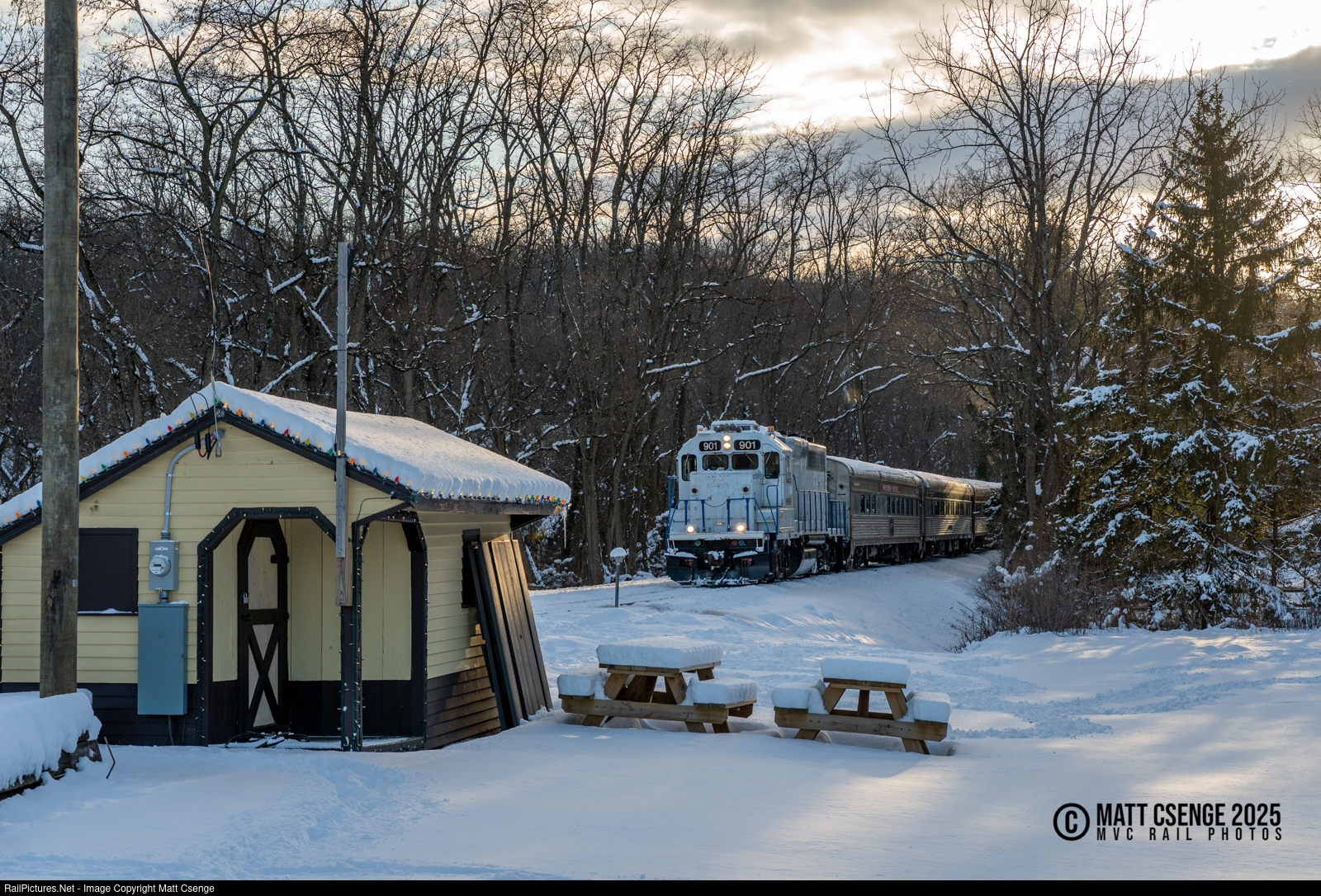 New Hope Railroad (NHRR) GP39 no. 901 is seen leading the North Pole Express east out of Lahaska Station as it returns to the namesake town. The unit is a recent arrival to the NHRR, formerly a work / freight locomotive for the Utah Transit Authority (UTA) FrontRunner commuter rail system in Salt Lake City, arriving here in August 2024. It was built in 1967 as Louisville & Nashville (L&N) GP40 no. 3025, and served Seaboard (no. 6821), CSX (no. 6821), and Virginia Railroad Express (GP39 no. V07) prior to UTA service.