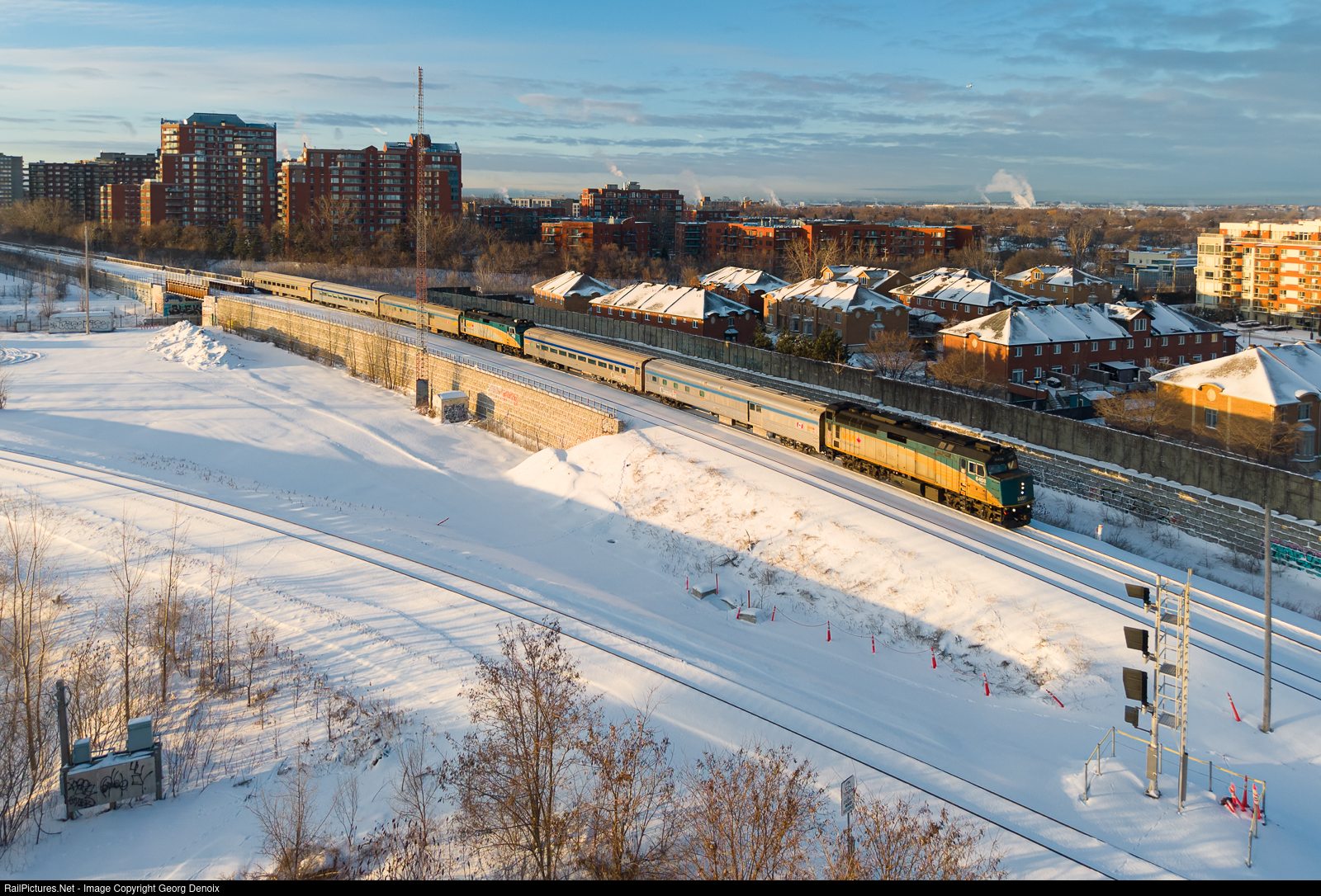 | VIA Rail's combined Abitibi/Saguenay service is greated by warm sunlight on a crisp January morning, headed North on CN's Saint-Laurent sub, near the new Côte-de-Liesse station. Power are VIA's F40PH 6408 and 6435 for the section to Jonquière. |