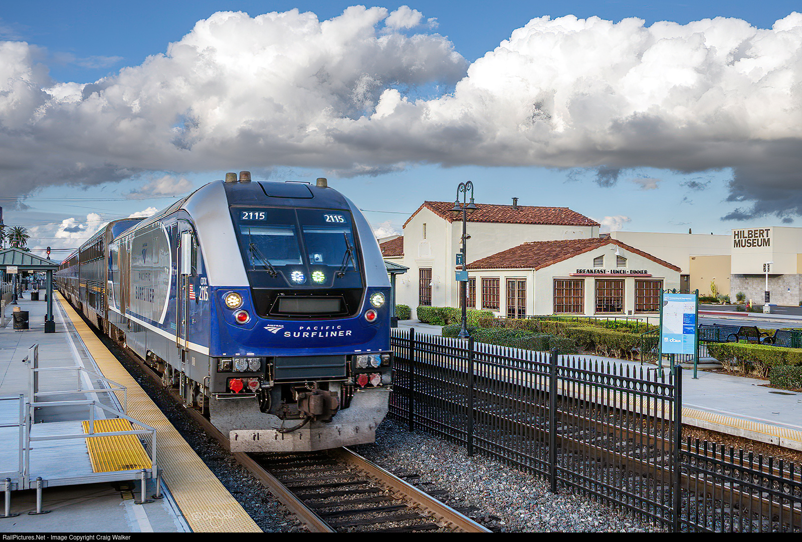 In the distance is the old Atchison Topeka & Santa Fe passenger station, which is the Metrolink stop, although the building itself is now a restaurant, the "Streamliner Diner".