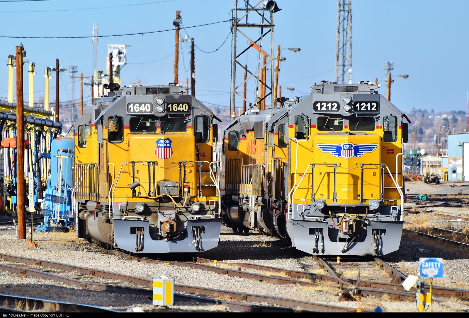 | A gaggle of Union Pacific light power sit in the North Yard in Denver, Colorado, waiting for the call to duty. |