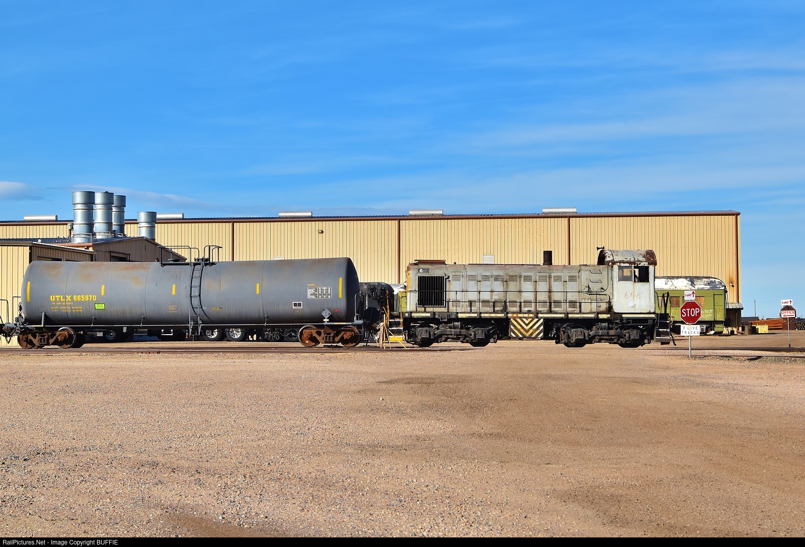 | Hudson Terminal Railroad's veteran Alco S1 shoves a cut of oil cans in the yard in Hudson, Colorado.