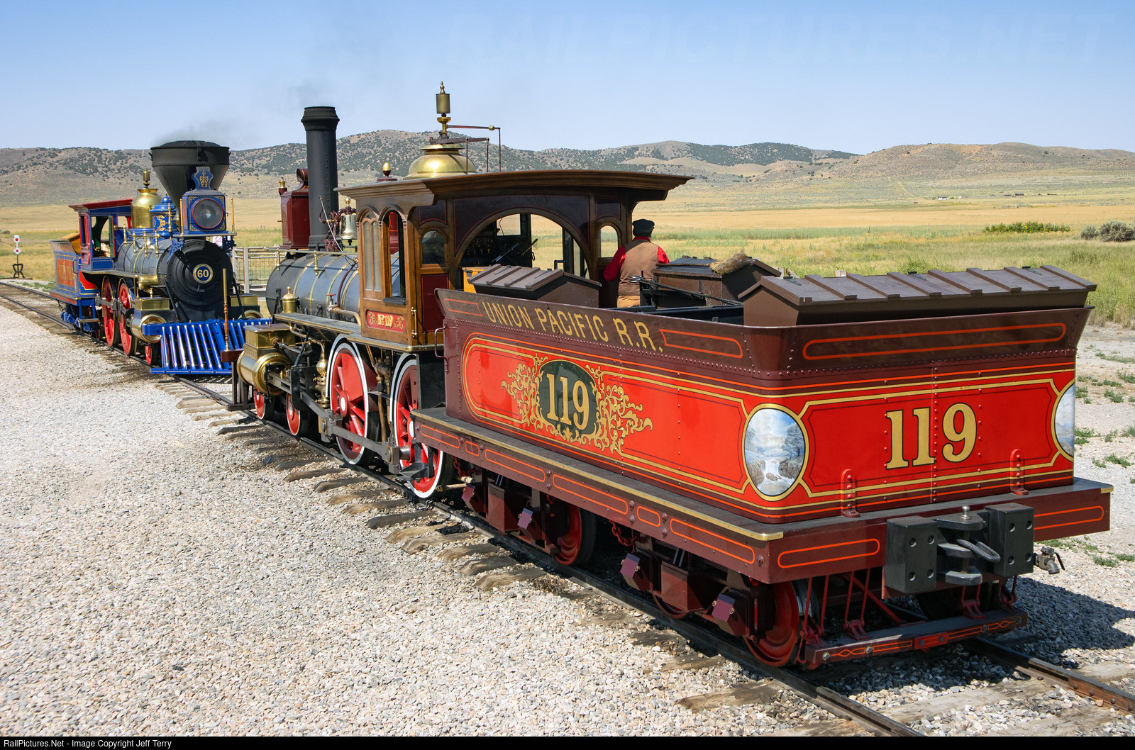 The locomotives that met at Promontory, Utah, in 1869 - Union Pacific's 119 and Central Pacific's Jupiter - were rolling works of art painted in various shades of red, crimson, blue, and green and featuring polished brass and original artwork. These locomotives are full-sized replicas that were finished in 1979.