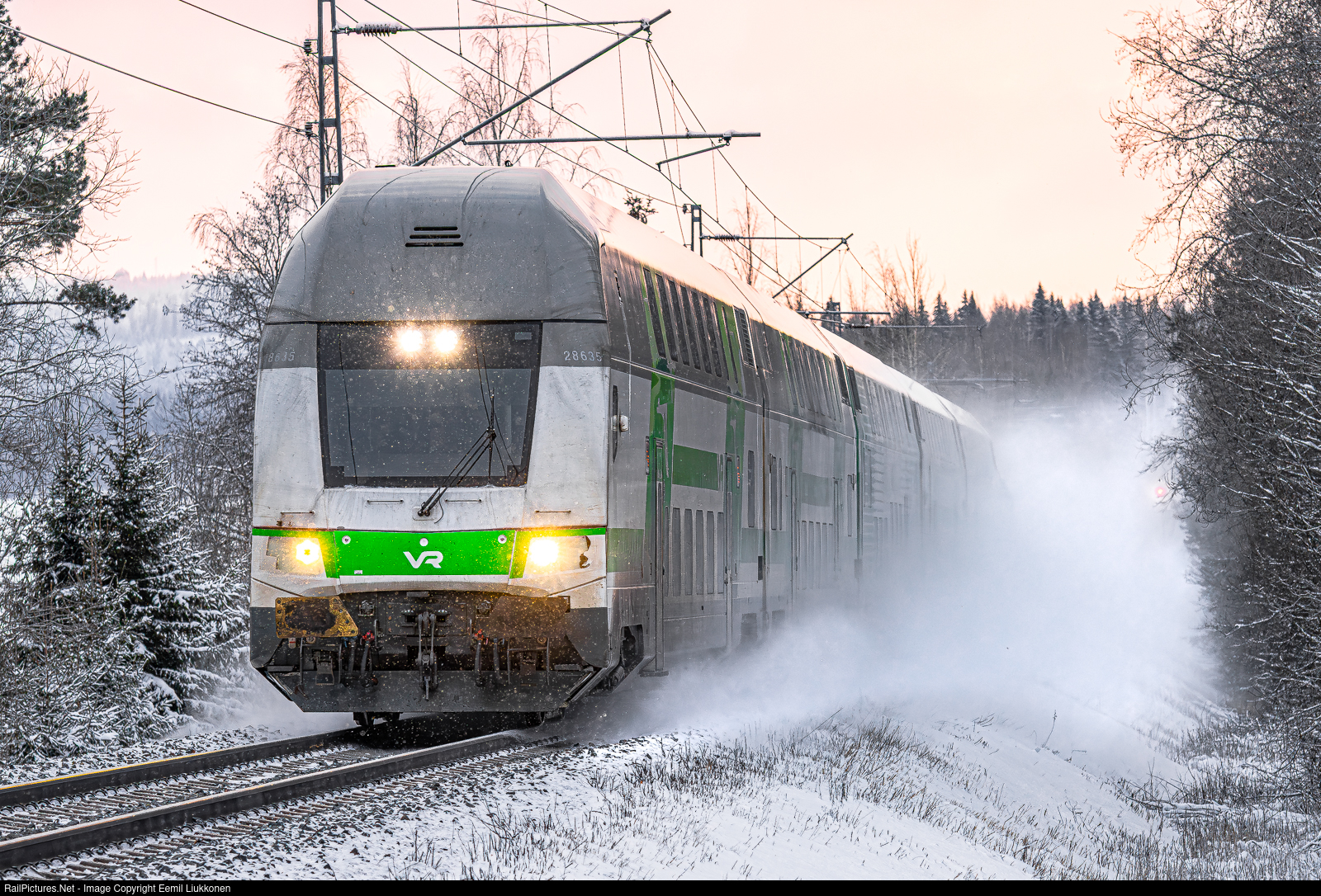 VR's double decker train is speeding uphill near Siilinjärvi. Snow as pilled next to the rails and as the train speeds, it lefts a misty snow curtain behind its trail.
