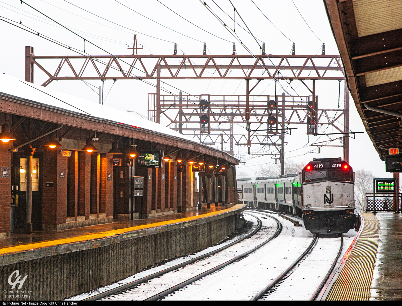 | After some light overnight snow, 1 of the 2 remaining F40s on New Jersey Transit's roster pushes a morning rush hour train from Lake Hopatcong via the Montclair Line towards Hoboken and out of Newark Broad Street. |