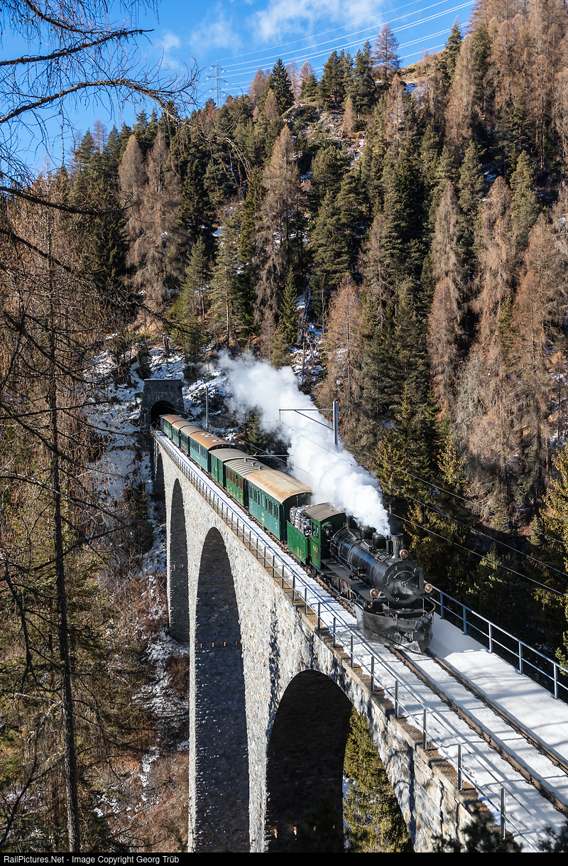 | "Engiadine Steam Train" of the Rhaetian Railway from Samedan to Scuol-Tarasp and back, with 2-8-0 G 4/5 # 108 "Engiadina", built by SLM Winterthur in 1906. The train 92930 is crossing the 136 meter long and 53 meter high Val Püzza viaduct of 1912 between Ardez and Ftan Baraigla. The train comes out of the 2350 meter long Tasna tunnel. |