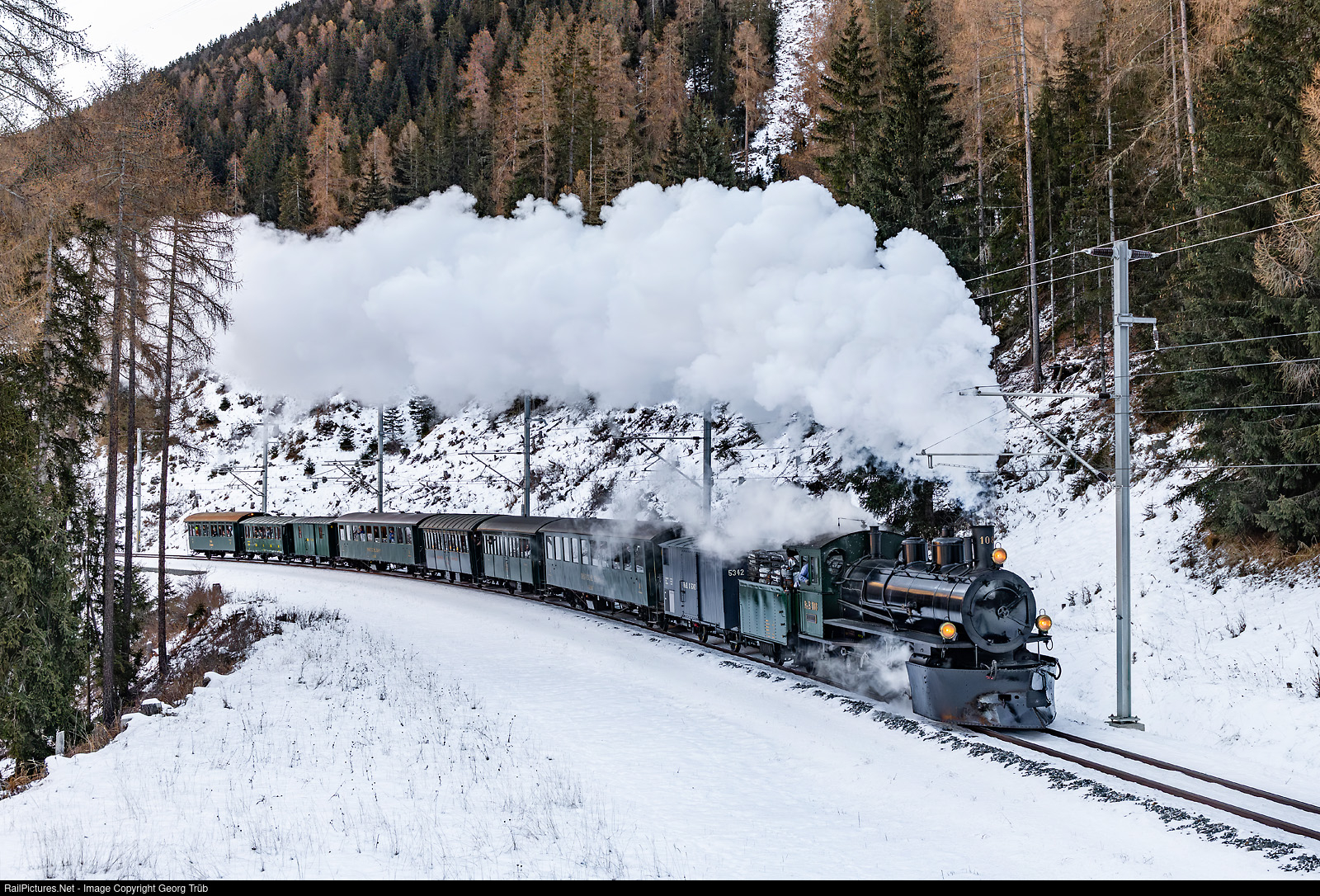 | "Engiadine Steam Train" of the Rhaetian Railway from Samedan to Scuol-Tarasp and back, with 2-8-0 G 4/5 # 108 "Engiadina", built by SLM Winterthur in 1906. The train 92943 is on the return journey, tackling the steady 2.5 % grade from Zernez towards Carolina. For the first time since 19 years, the locomotive is fitted with the large snow pluogh again. |