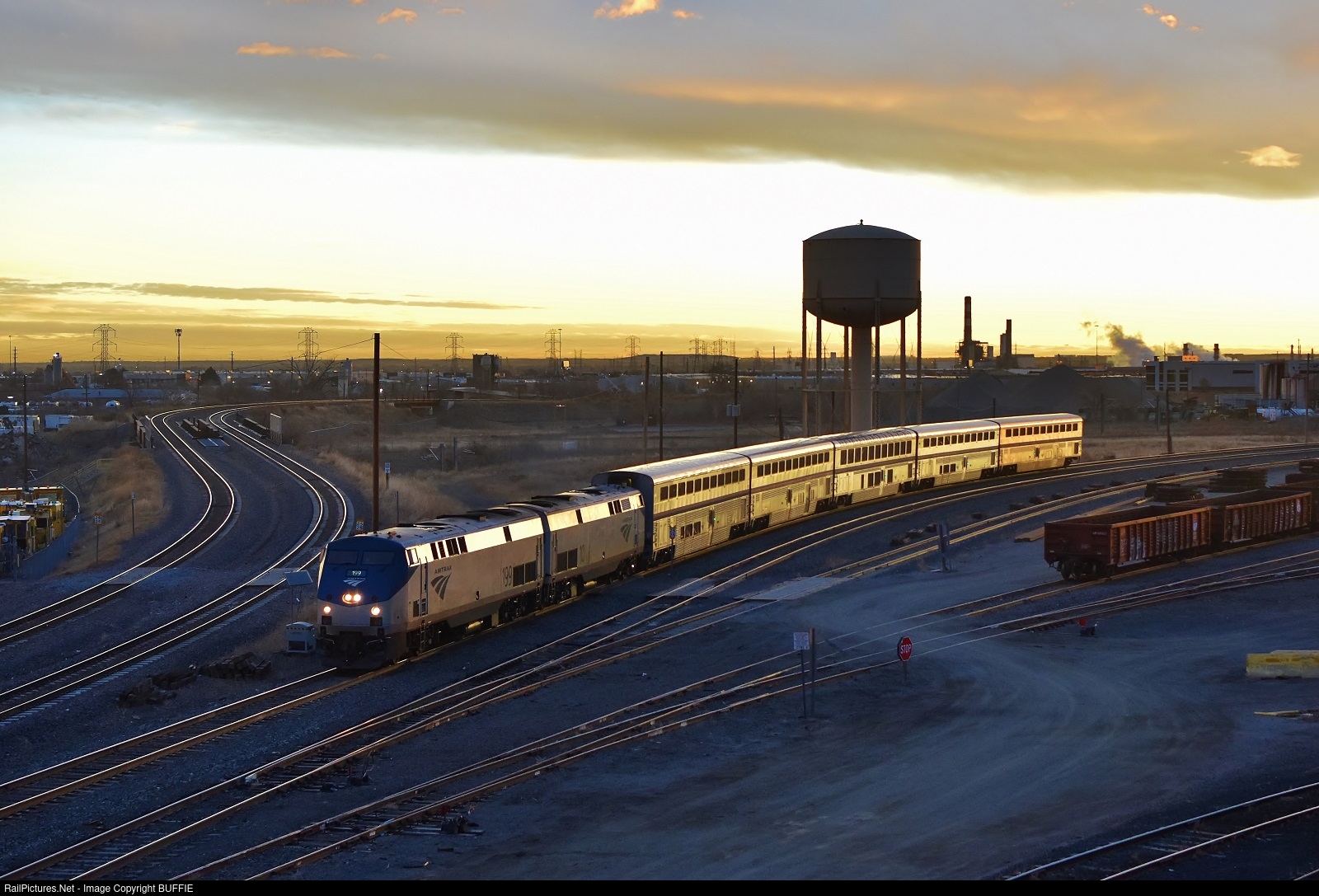 | Amtrak engine #199 leads the Amtrak Winter Park Express Ski Train through the North Yard in Denver, Colorado as sunrise starts to break through the storm clouds.