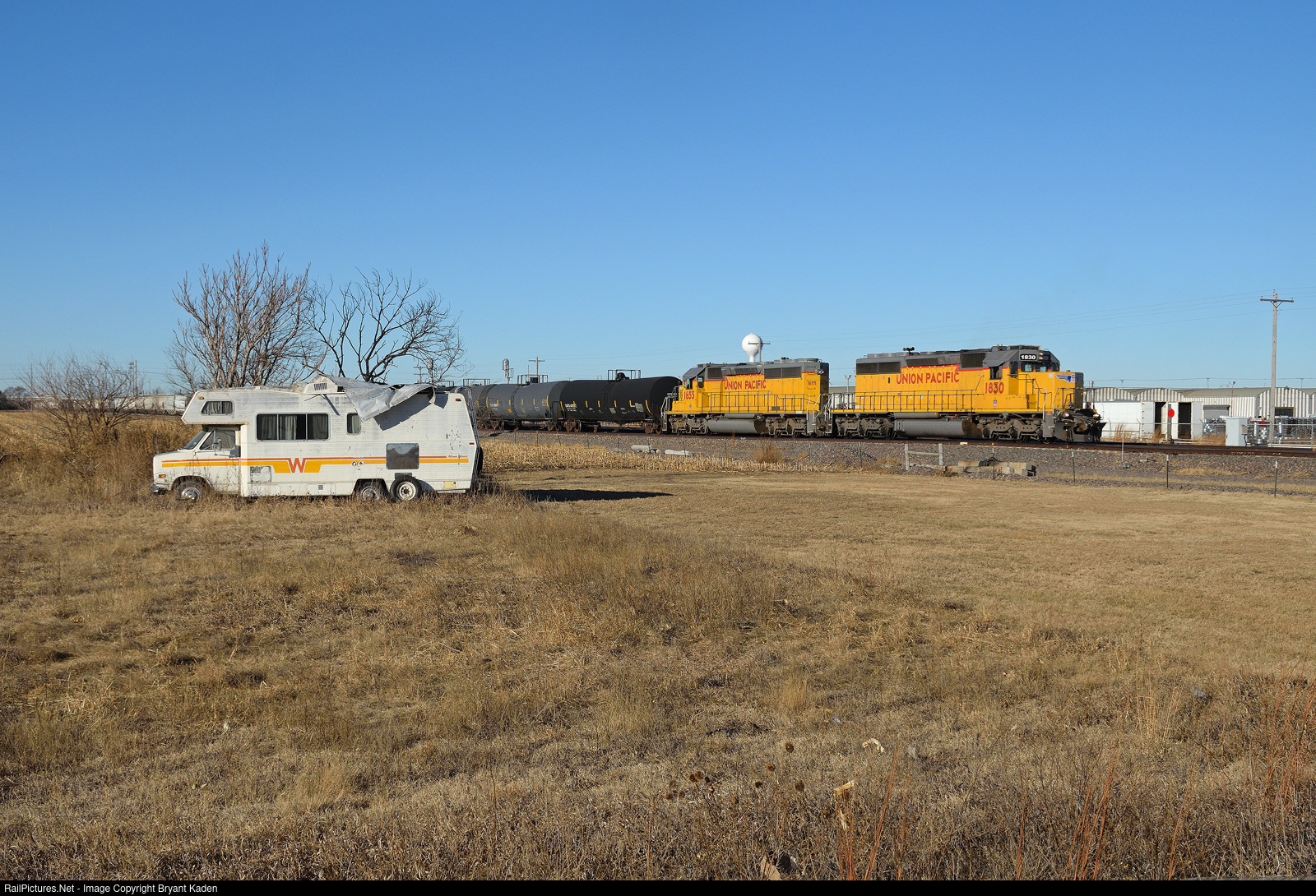 | Classics of the 1980's meet as a pair of Union Pacific SD40's work on the east side of Columbus, NE and a "Minnie Winnie" Winnebago sits nearby. |
