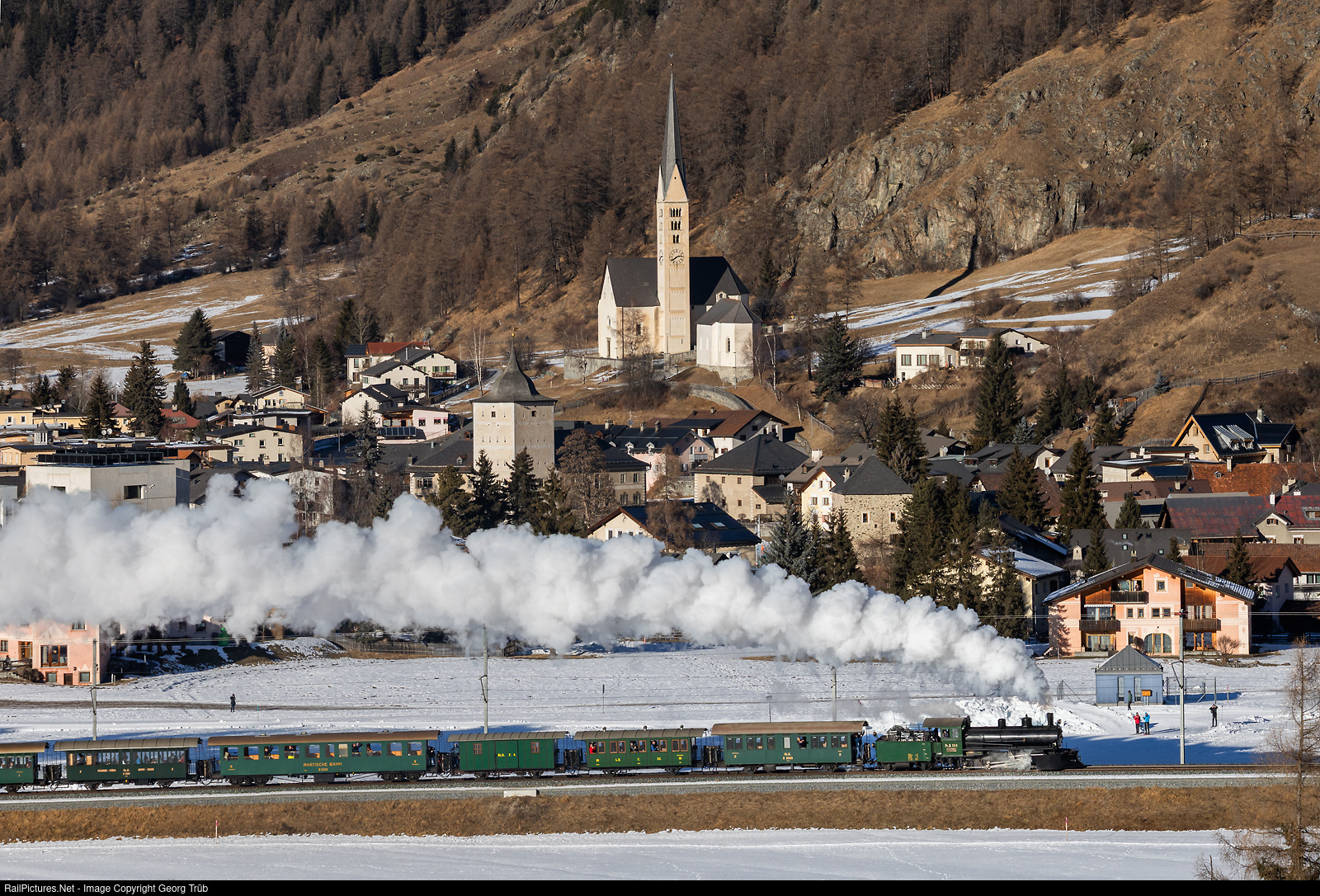 | "Engiadine Steam Train" of the Rhaetian Railway from Samedan to Zernez and back, with 2-8-0 G 4/5 # 108 "Engiadina", built by SLM Winterthur in 1906. The train was turned over the triangle on the south side of the Vereina tunnel and is now on the return journey as 92943 from Zernez towards Carolina. |