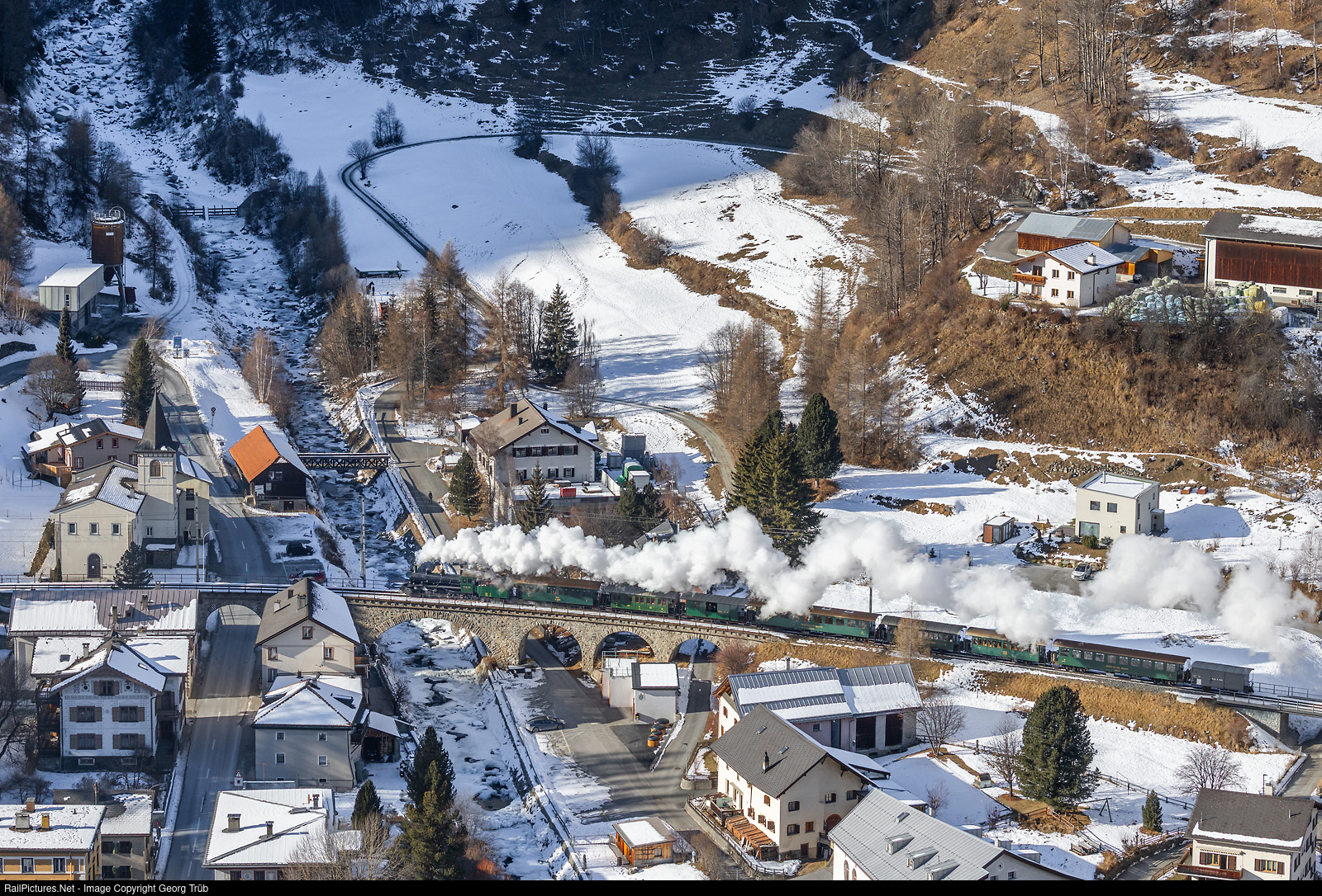 | "Engiadine Steam Train" of the Rhaetian Railway from Samedan to Zernez and back, with 2-8-0 G 4/5 # 108 "Engiadina", built by SLM Winterthur in 1906. The train was turned over the triangle on the south side of the Vereina tunnel and is now on the return journey as 92943 from Saglains to Zernez, crossing the Susasca bridge in the village of Susch. |