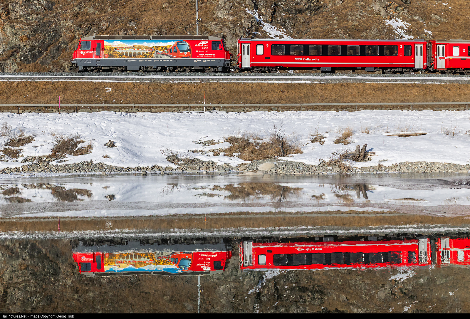 | Ge 4/4 III # 644 of the Rhaetian Railway in the special paint scheme for the world's longest narrow gauge passenger train pulls the IR 1121 of the line IR38 from Chur to St.Moritz along the Inn river between Samedan and Celerina. |