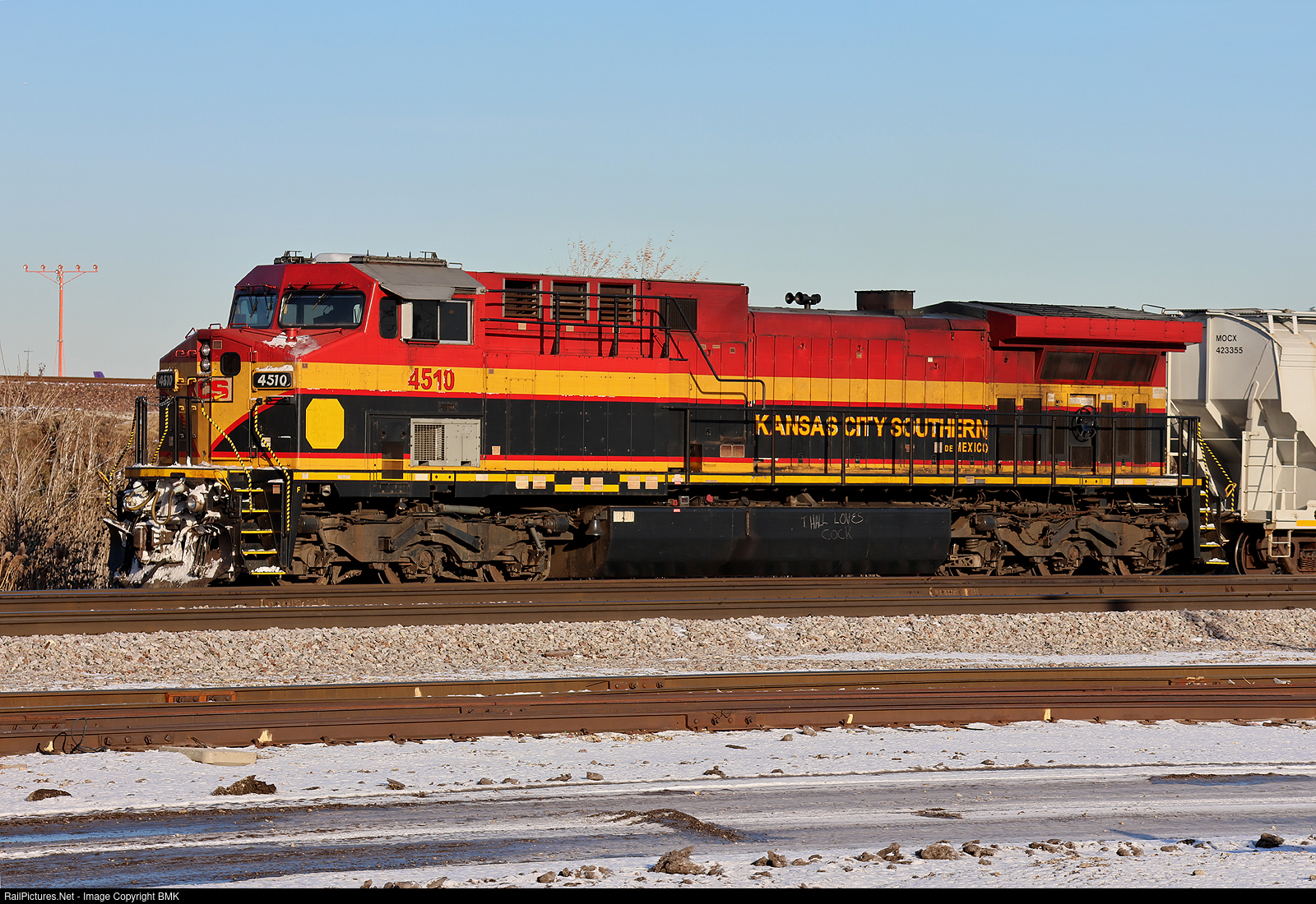 KCSM 4510 brings up the rear of the CPKC 246 rolling into Bensenville Yard. Someone had to get the news out as shown on the fuel tank. So much for being a family friendly hobby of train spotting!