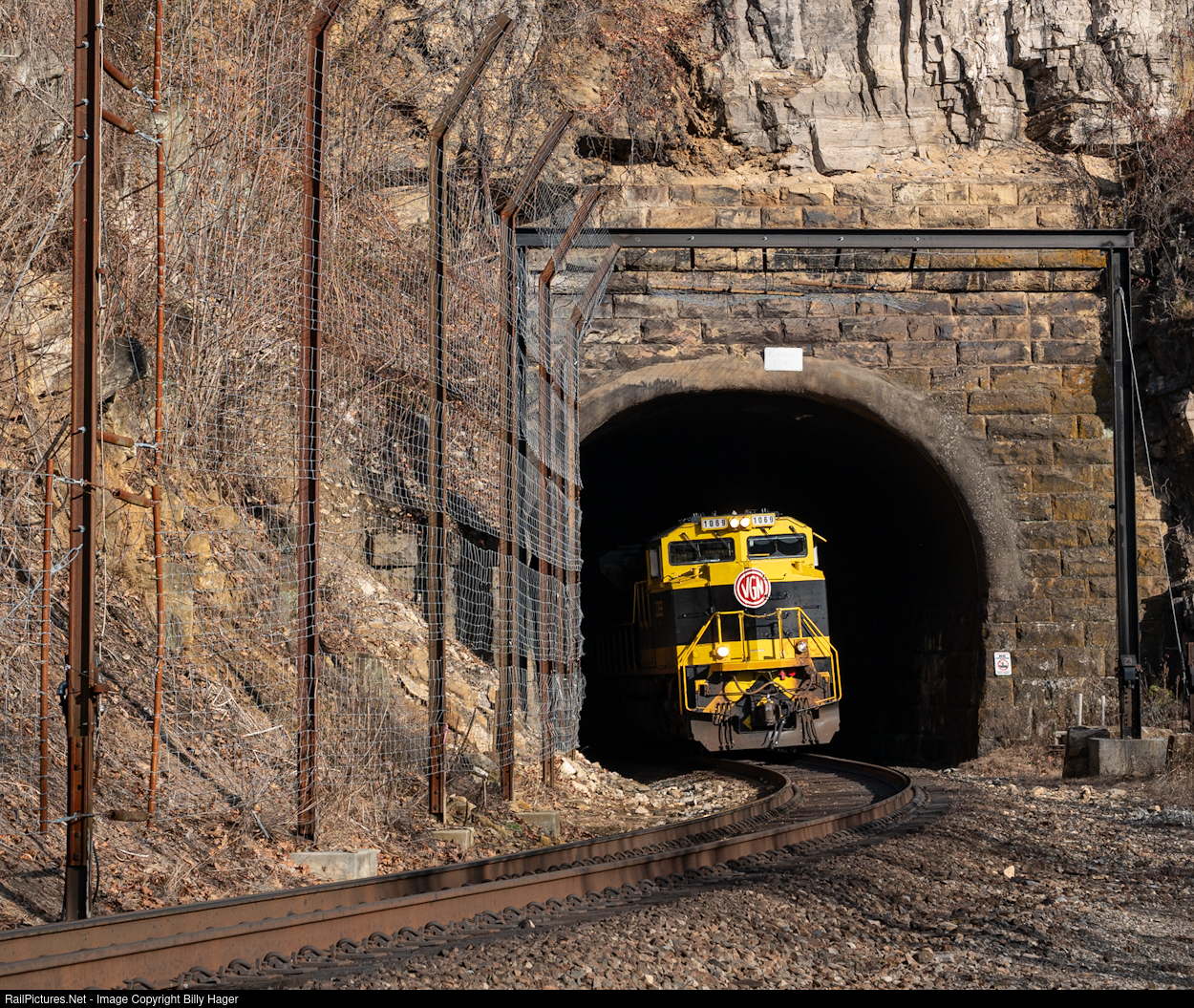 | A very short NS 278 with the Virginian heritage unit leading, exiting Pembroke Tunnel at Pembroke, Virginia, on their way to Roanoke via the Christiansburg District. |