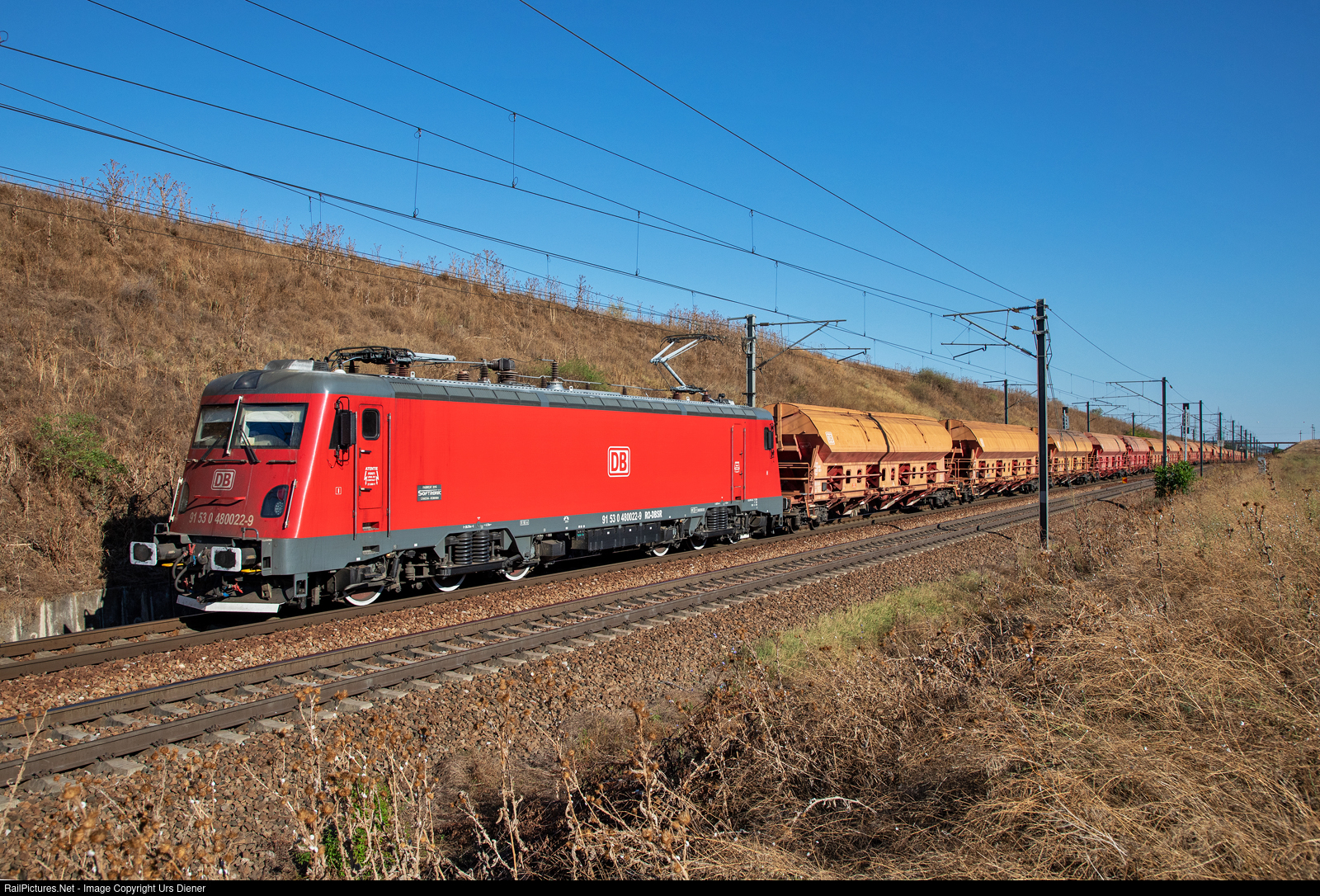 | DB Cargo Romania is pulling a covered hopper wagon train towards the Black Sea with the Transmontana type locomotive number 450 022, built by Softronic in 2016. |
