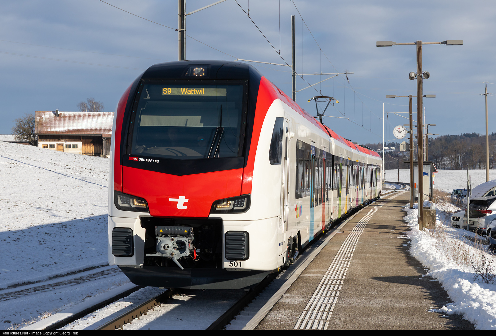 On January 5, 2026, the railway company Thurbo, a 90% subsidiary of SBB, began using the first new Flirt Evo trains from StadlerRail in scheduled service. RABe 533 # 501 “Thurgau,” the first in a series of 19 four-car trains, is traveling in Lütisburg as 11936 of the S9 line from Wil SG to Wattwil.