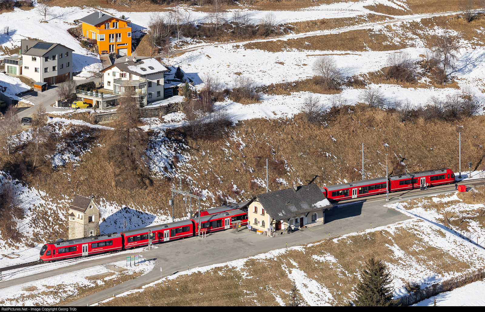 Many station buildings on the line through the Engadin between Bever and Scuol-Tarasp are of the same type and were completed in time for the opening of the electrified line in 1913. Regional trains on the R15 Pontresina-Scuol-Tarasp line cross at Susch every hour on the hour. There are currently no rail-free access points or disabled-friendly platforms here. The first train arrives on track 1, the second on track 2. At 12 noon, the “Capricorn” ABe 4/16 # 3156 departs from track 1 as train 1936 from Scuol-Tarasp to Pontresina, after train 1936 in the opposite direction with the ABe 4/16 # 3148 arrived on track 2. Another typical feature is the tower-like building on the left, which used to house the catenary switches and could be seen at all stations. The view is from the ruins of the Fortezza Rohan of the 17th century, 150 meter above Susch on the Chaschinas hill.