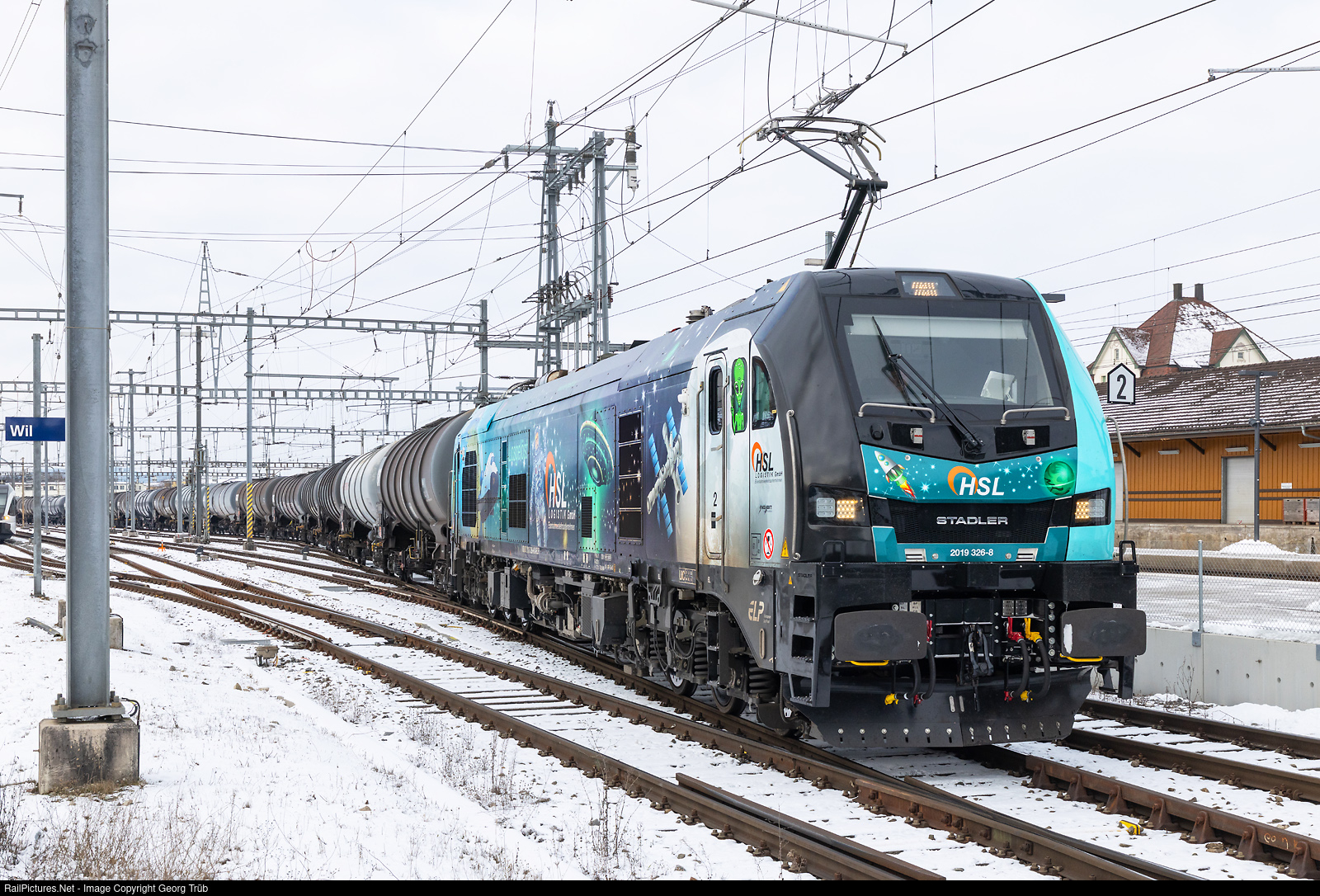 | New Euro9000 locomotive 2019 # 326 "Space Oddity" of the European Loc Pool (ELP), rented to HSL Logistik, with an empty tank car train from Bettwiesen (Tägerschen fuel depot) via Wil SG-Basel to Grosskorbetha/Germany, in Wil SG. The about 350 meter long train entered track 4 and is now pushed back in the freight yard, where the loc will go around. The train ran for TXLCH (TX Logistik) in Switzerland. |