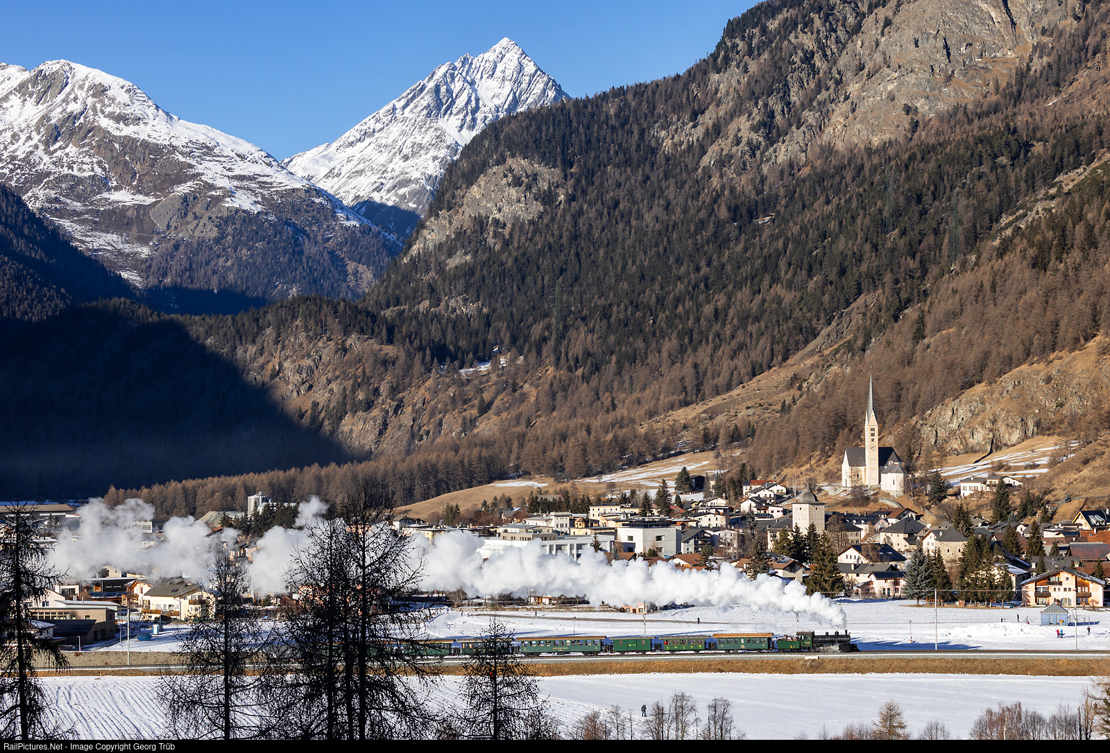 | "Engiadine Steam Train" of the Rhaetian Railway from Samedan to Zernez and back, with 2-8-0 G 4/5 # 108 "Engiadina", built by SLM Winterthur in 1906. The train was turned over the triangle on the south side of the Vereina tunnel and is now on the return journey as 92943 from Zernez towards Carolina. In the background the pyramide of 3410 meter high Piz Linard. |