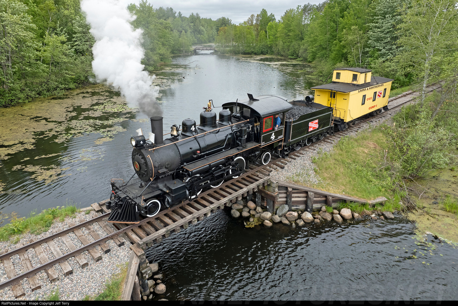 Laona & Northern's "4-Spot" steams over the Rat River in Wisconsin's scenic northwoods. This rare Vulcan-built Prairie has been operating on these rails for much of its life. In June and August, it transports visitors from the depot in Laona to the Camp Five Museum, a recreated logging camp.