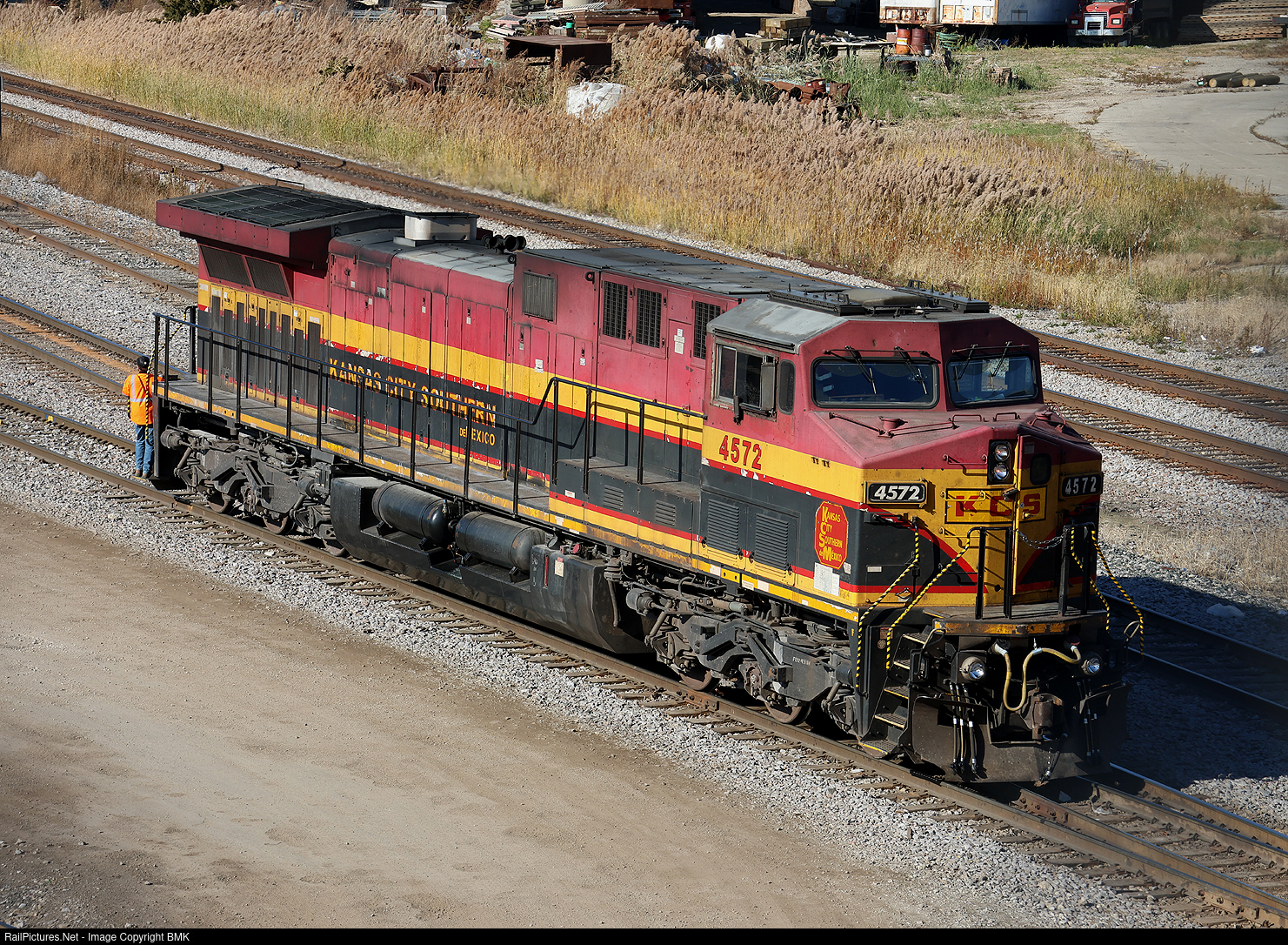 The conductor watches the shove as KCSM 4572 rolls back to the service tracks at Bensenville Yard shortly after detaching from their train.