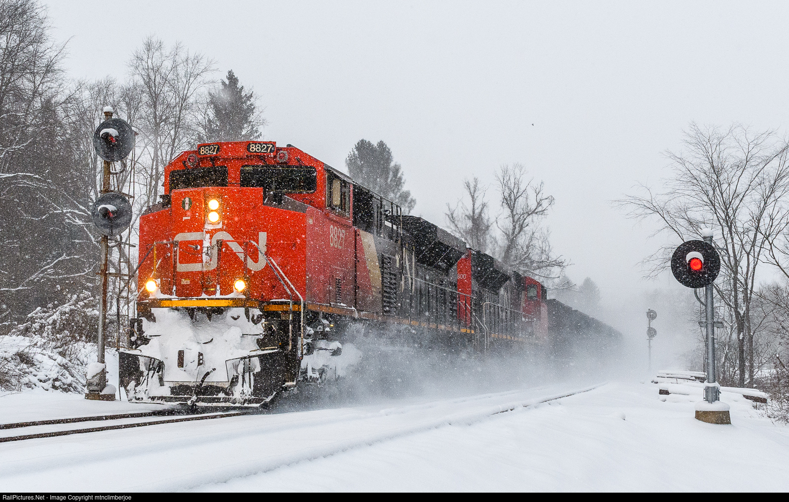 | With heavy lake effect snow hammering the region, loaded iron ore train U702 makes its way south on the Bessemer Subdivision behind a pair of Canadian National SD70M-2's. Splitting the searchlight signals, the train cruises through the MD North control point in Harmonsburg, Pennsylvania after recrewing in Conneautville.