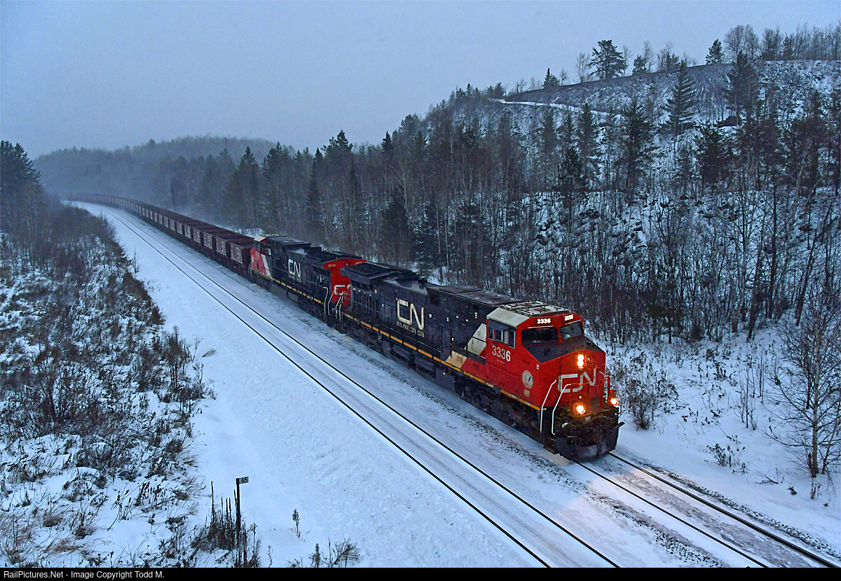 | After a meet at Biwabik with southbound loads, CN 3336 rolls around the curve at m.p. 65 on the Iron Range Sub as they head north to load their own 145 car train. |