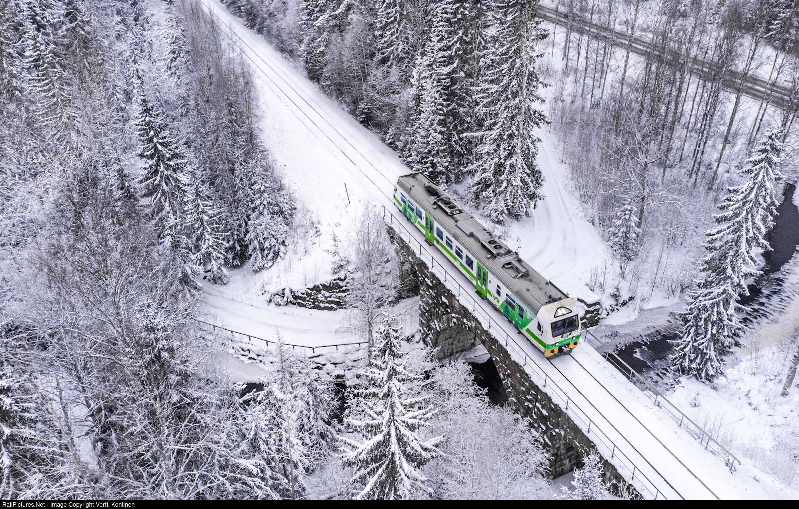 A morning railbus service HDM 482 crossing a stone arch bridge over a small stream just east of Petäjävesi.