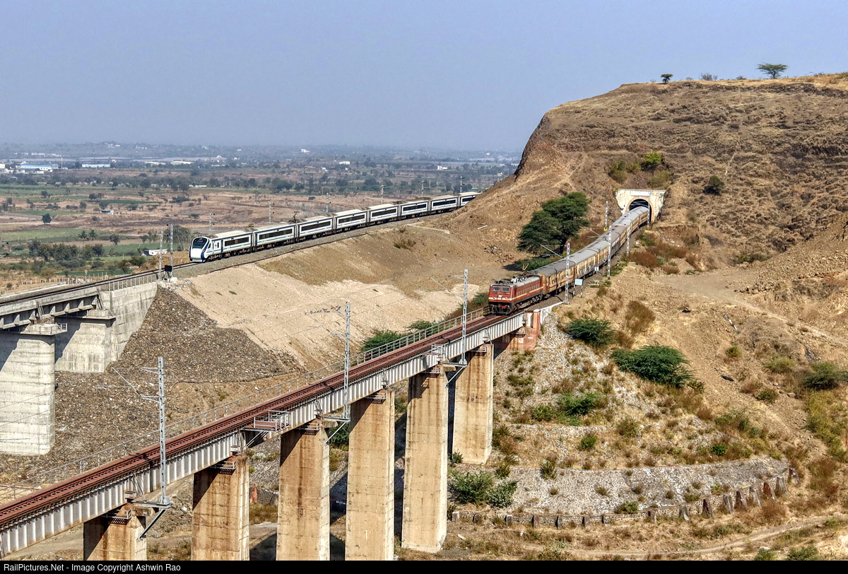 20674 Pune Kolhapur Vande Bharat Express crossing WAP4 #22633 hauled 11030 Kolhapur Mumbai Koyna Express at scenic Shindwane Ghat.