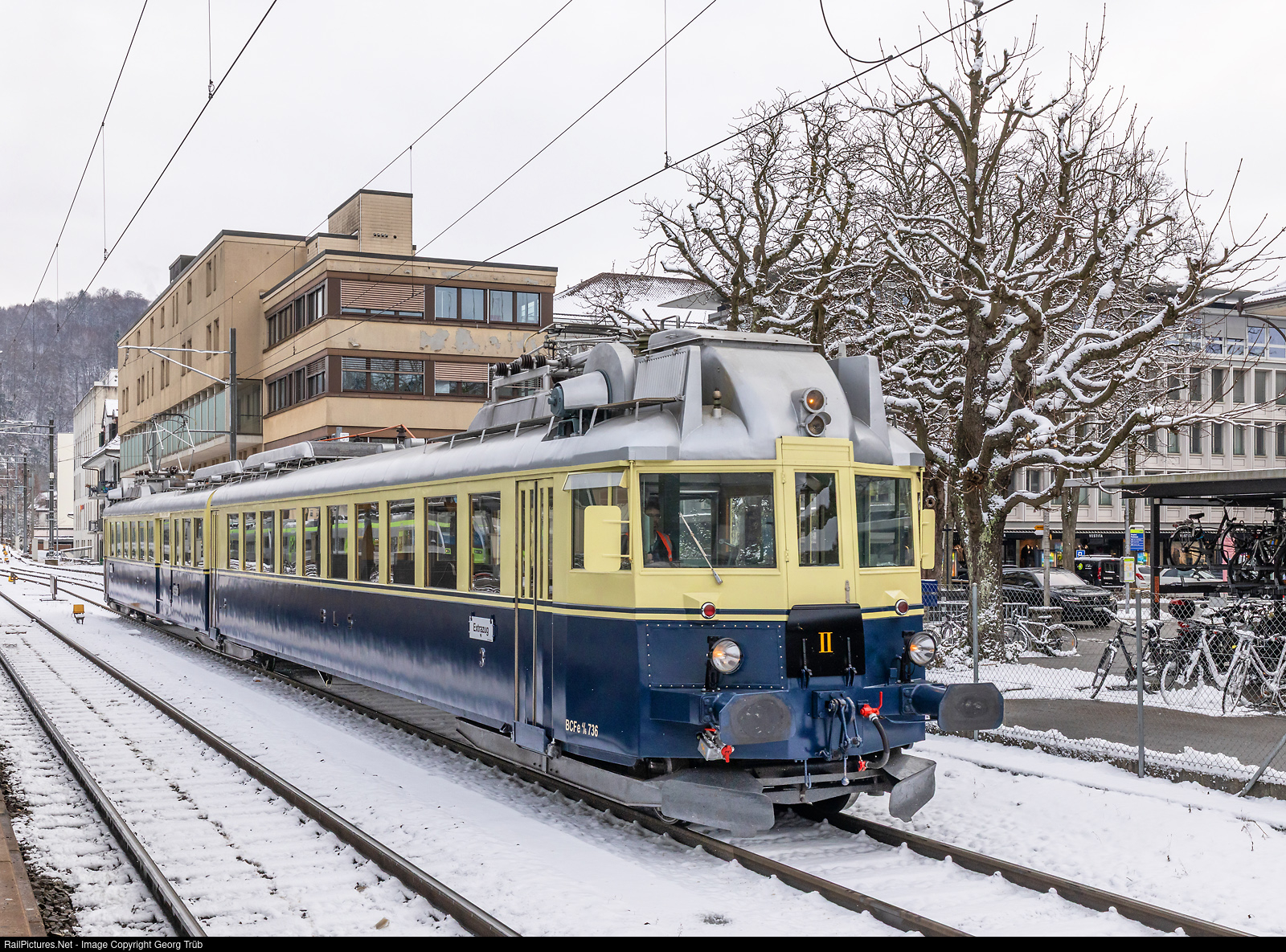 | "Blue Arrow" double railcar BCFe 4/6 # 736 of the "bls.historic" (BLS Foundation) made a public "Treberwurstfahrt" roundtrip, from Burgdorf via Zollikofen-Lyss-Biel-Neuchâtel-Yverdon-les-Bains - Estavayer-le-Lac - Payerne-Murten-Ins-Neuchâtel-Biel-Lyss-Zollikofen back to Burgdorf. This vehicle was built in 1938 by SIG Neuhausen and SAAS Sécheron in Geneva as BCFZe 4/6 # 736 for the Bern-Neuenburg-Bahn (BN) with 710 kW and 110 km/h maximum velocity. From 1985 the "Blue Arrow" was owned and operated by the Sensetalbahn (STB) as BDe 4/6 # 102. Restored and renovated for the BLS foundation from 2011 to 2014. |